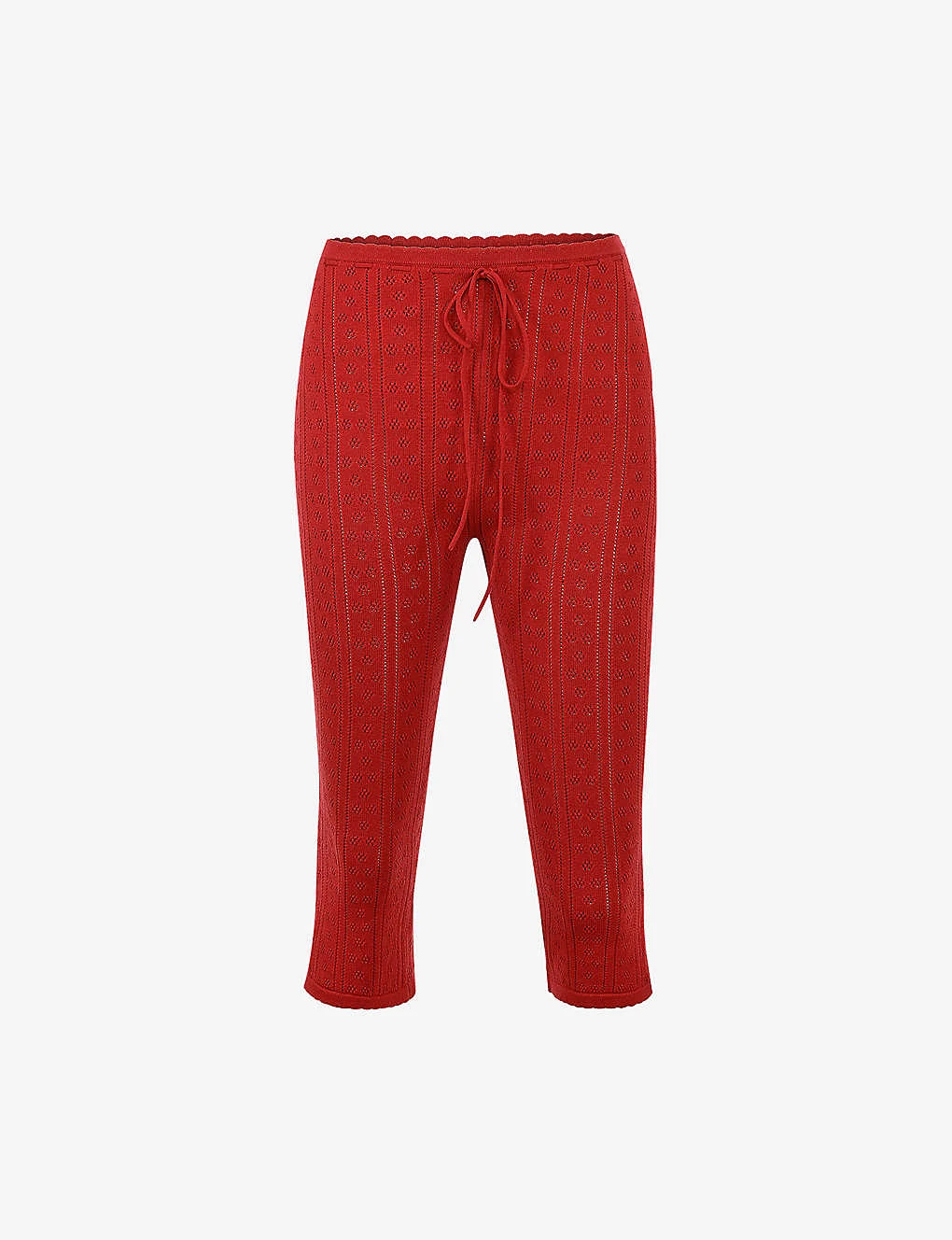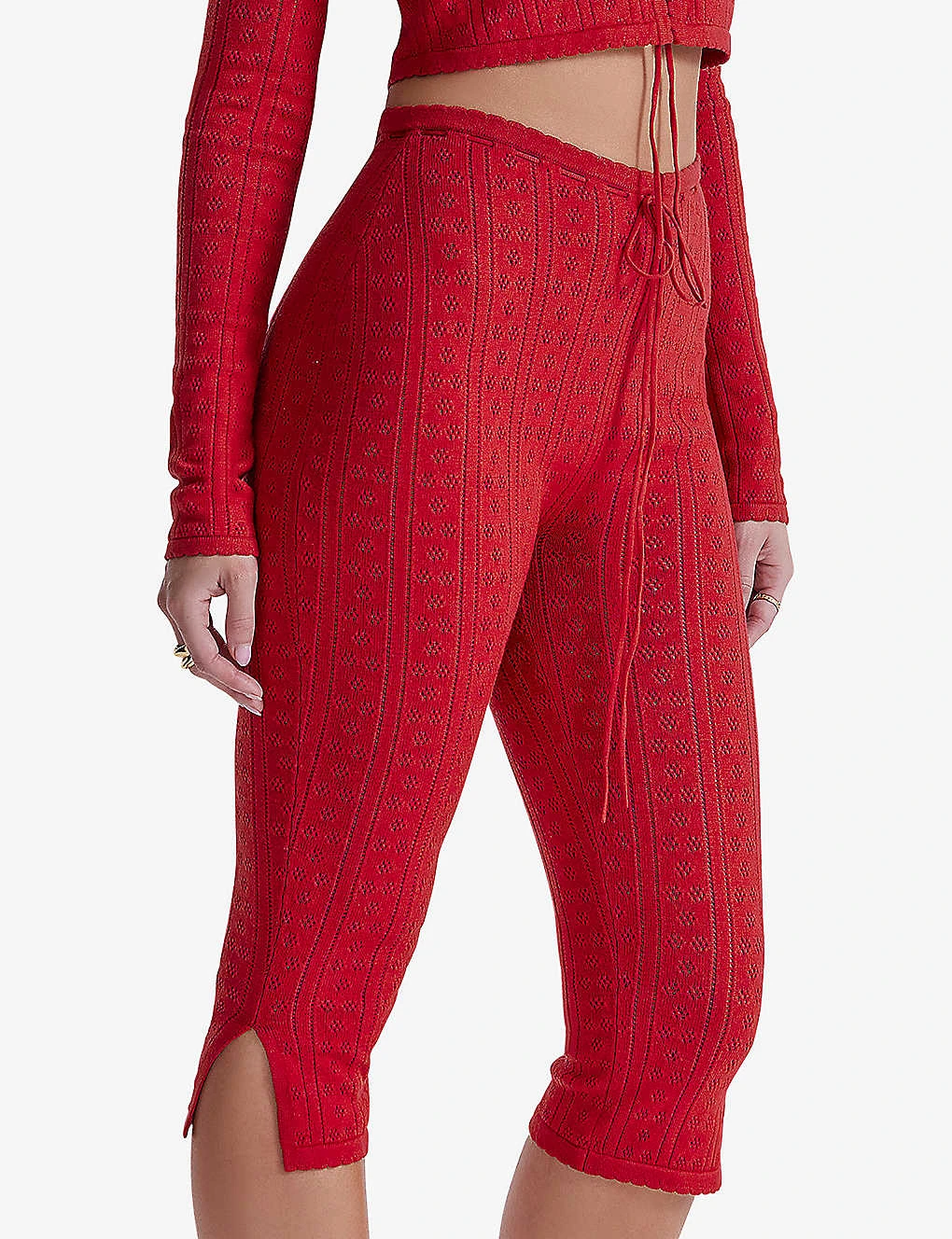 - Fitted, high rise, self-tie waist, knitted pointelle design, cropped, split hem