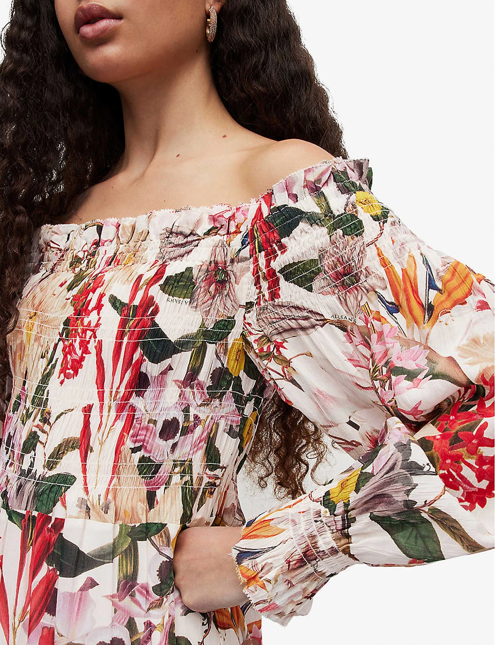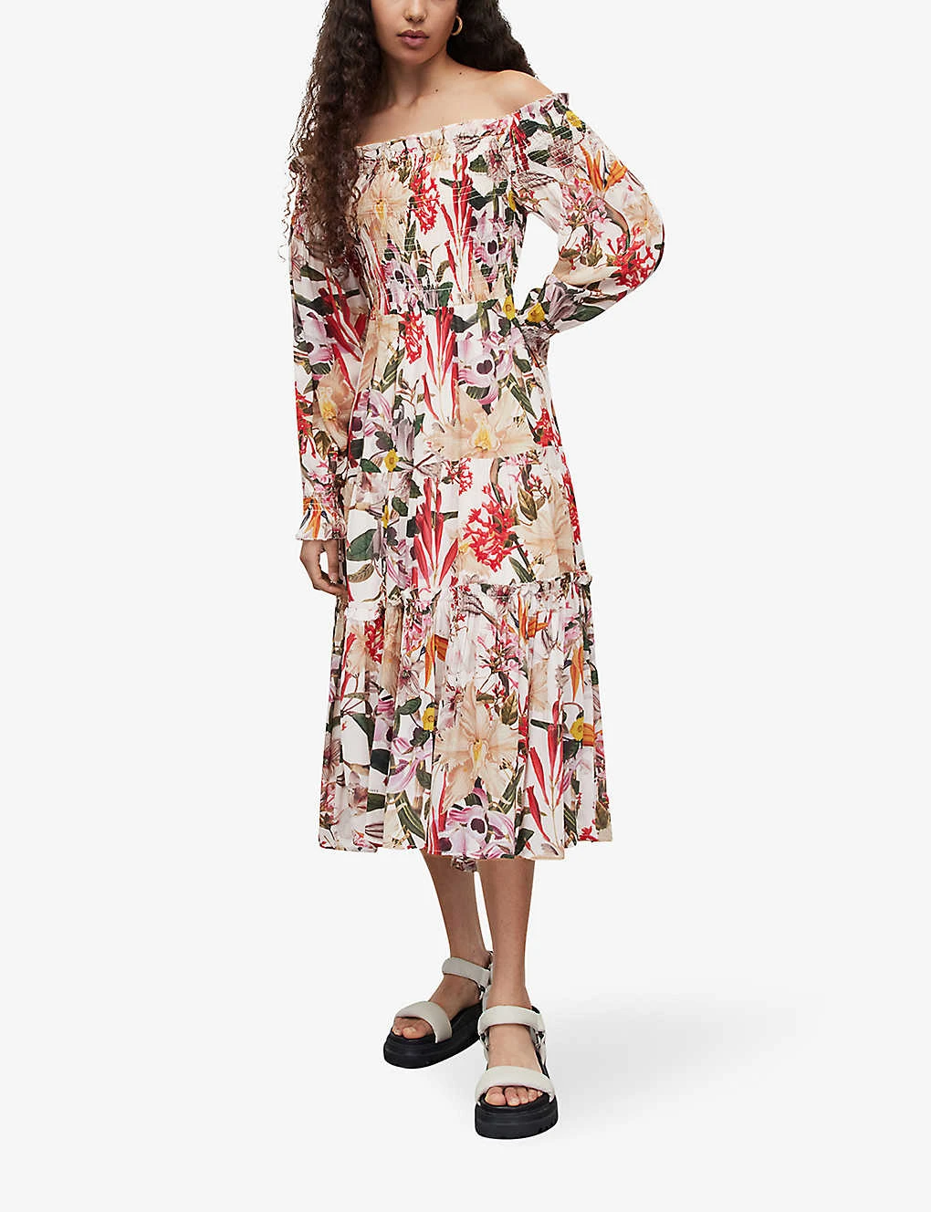 - Off-the-shoulder, long sleeves, elasticated cuffs, elasticated bodice, all-over floral print, contrast stitching, fitted waist, midi skirt