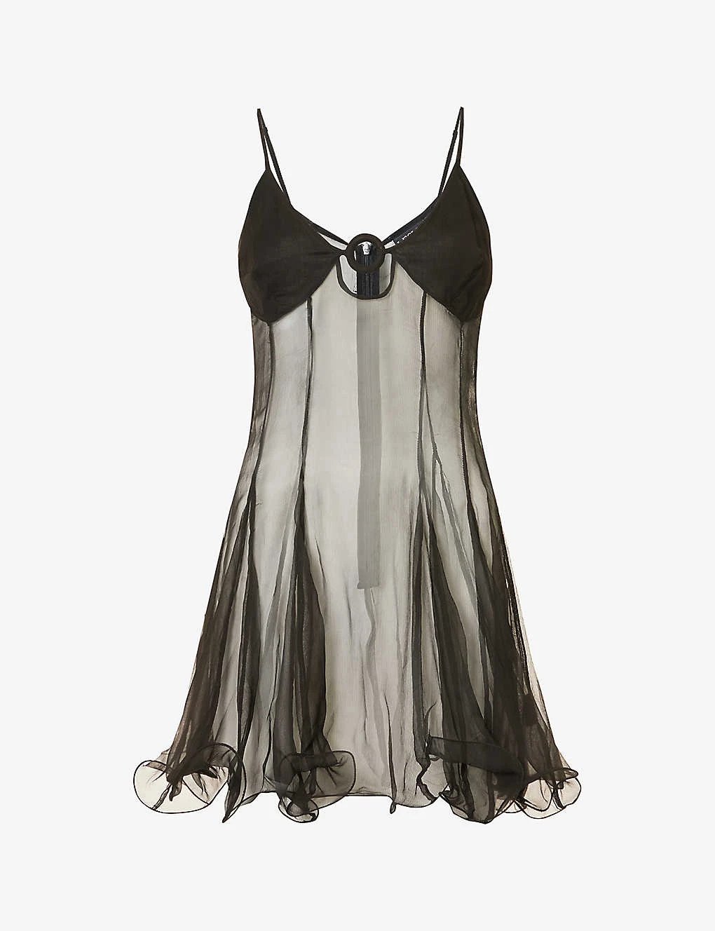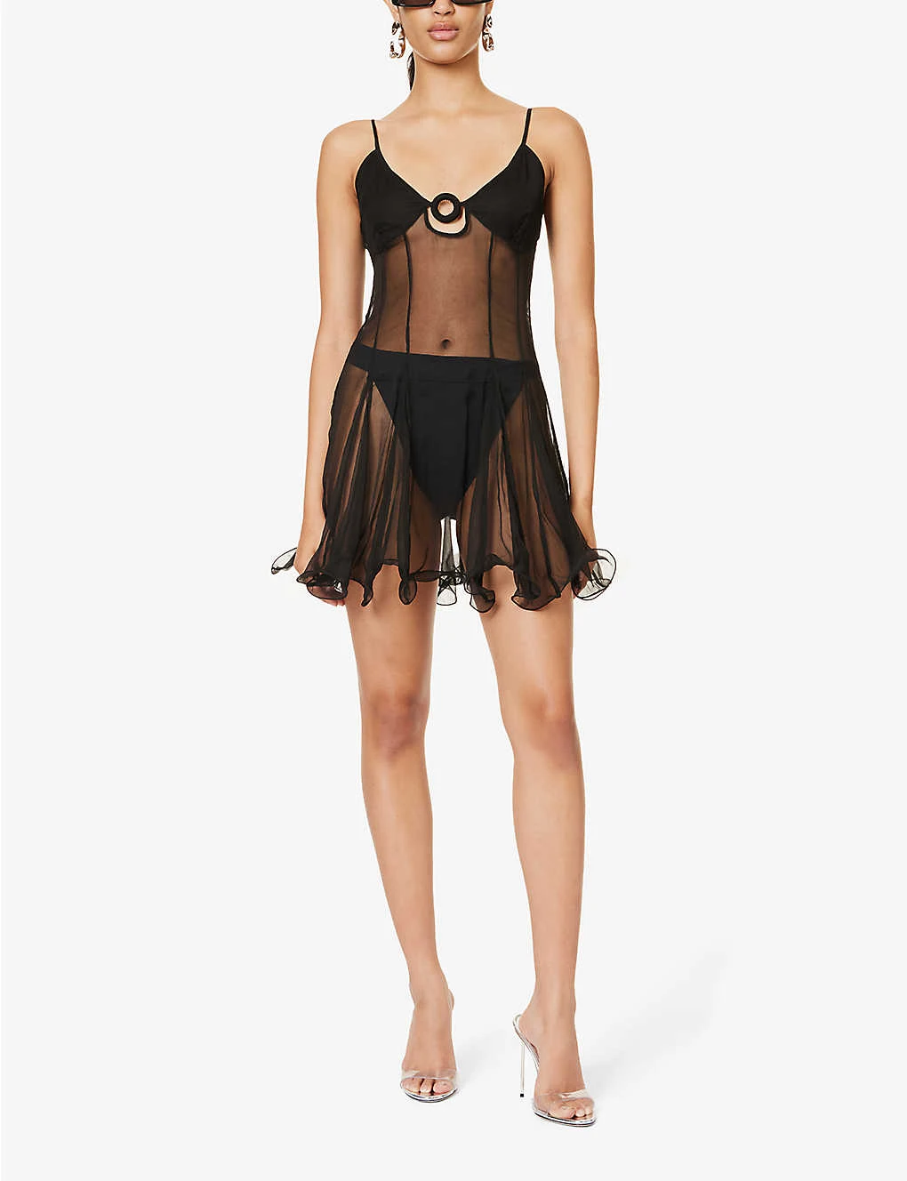 - Plunge neck, adjustable straps, triangle cups, O-ring at chest, semi-sheer, structured flared hem