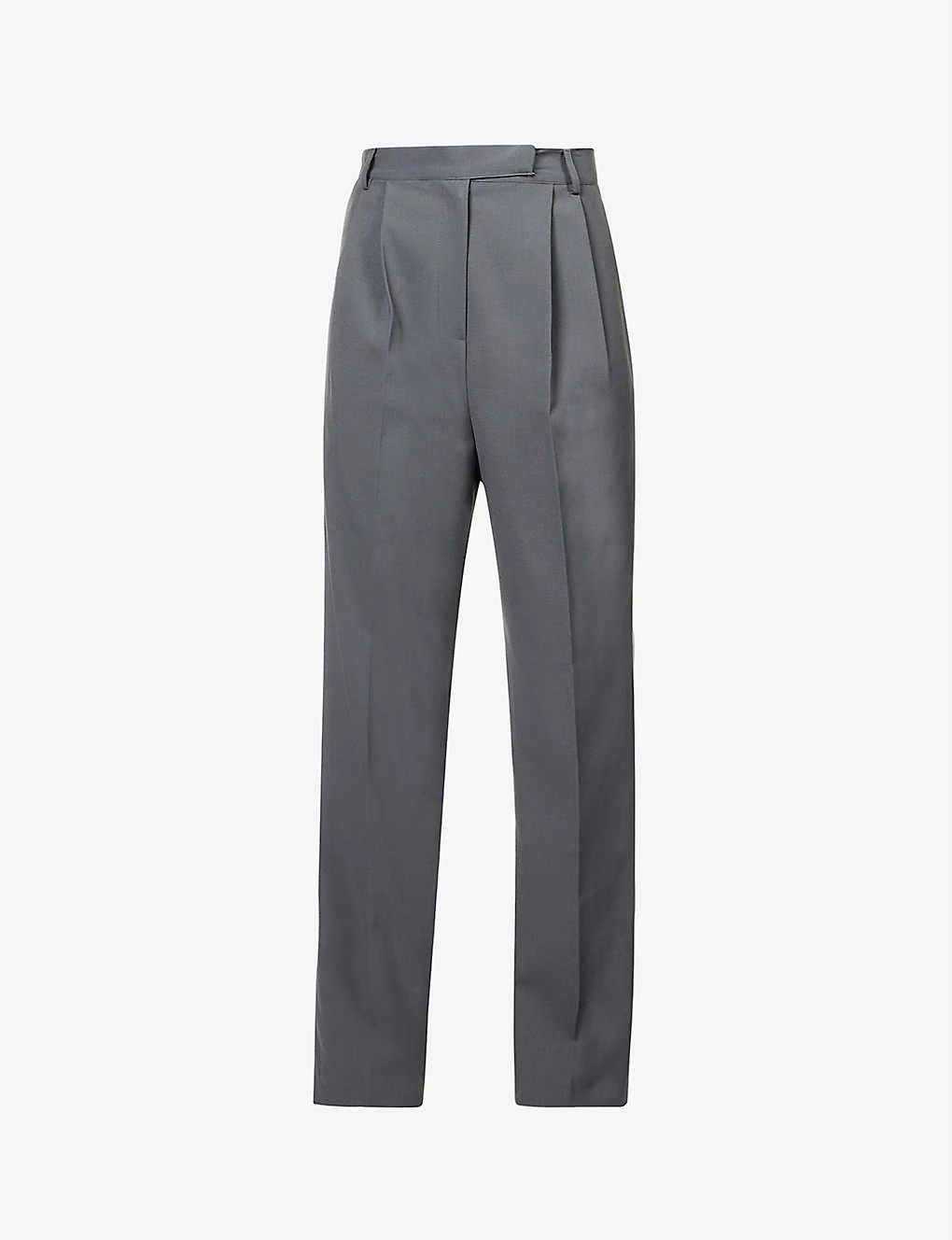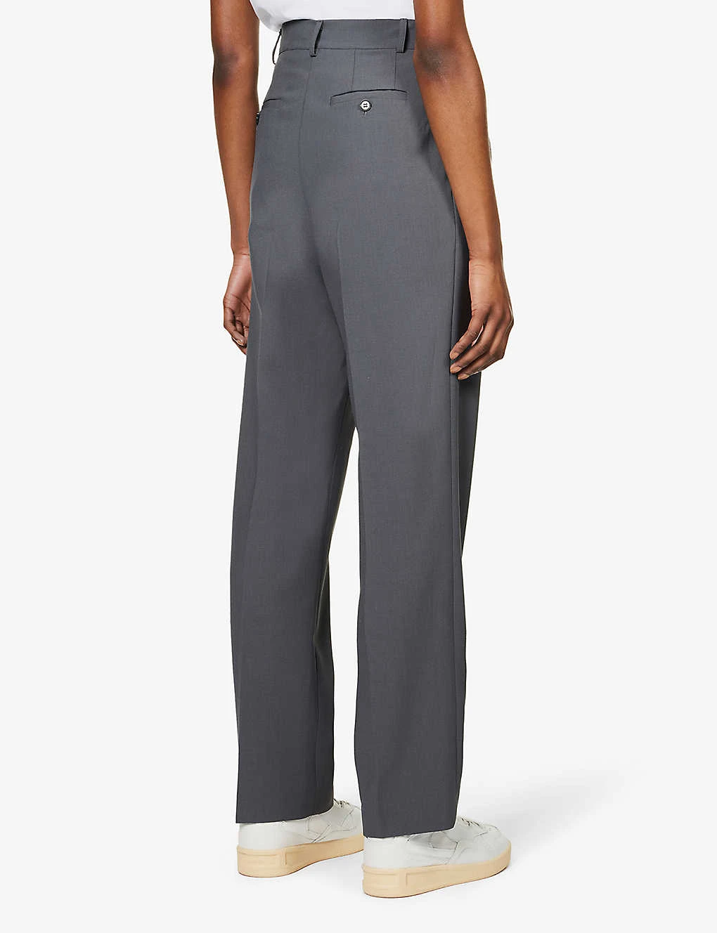 - Regular fit, high rise, straight leg, belt loops, two slip pockets at front, pleats at front, centre pressed creases at front and back, two buttoned welt pockets at back