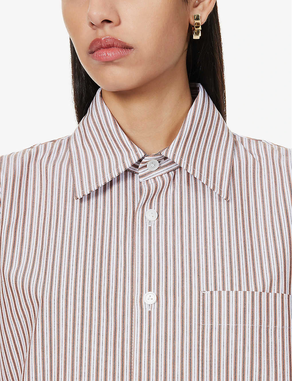- Relaxed fit, collar, long sleeves, buttoned sleeve hems, patch pocket at chest, straight yoke with pleat at back, all-over stripe pattern, branded pearlescent buttons, dipped curved hem