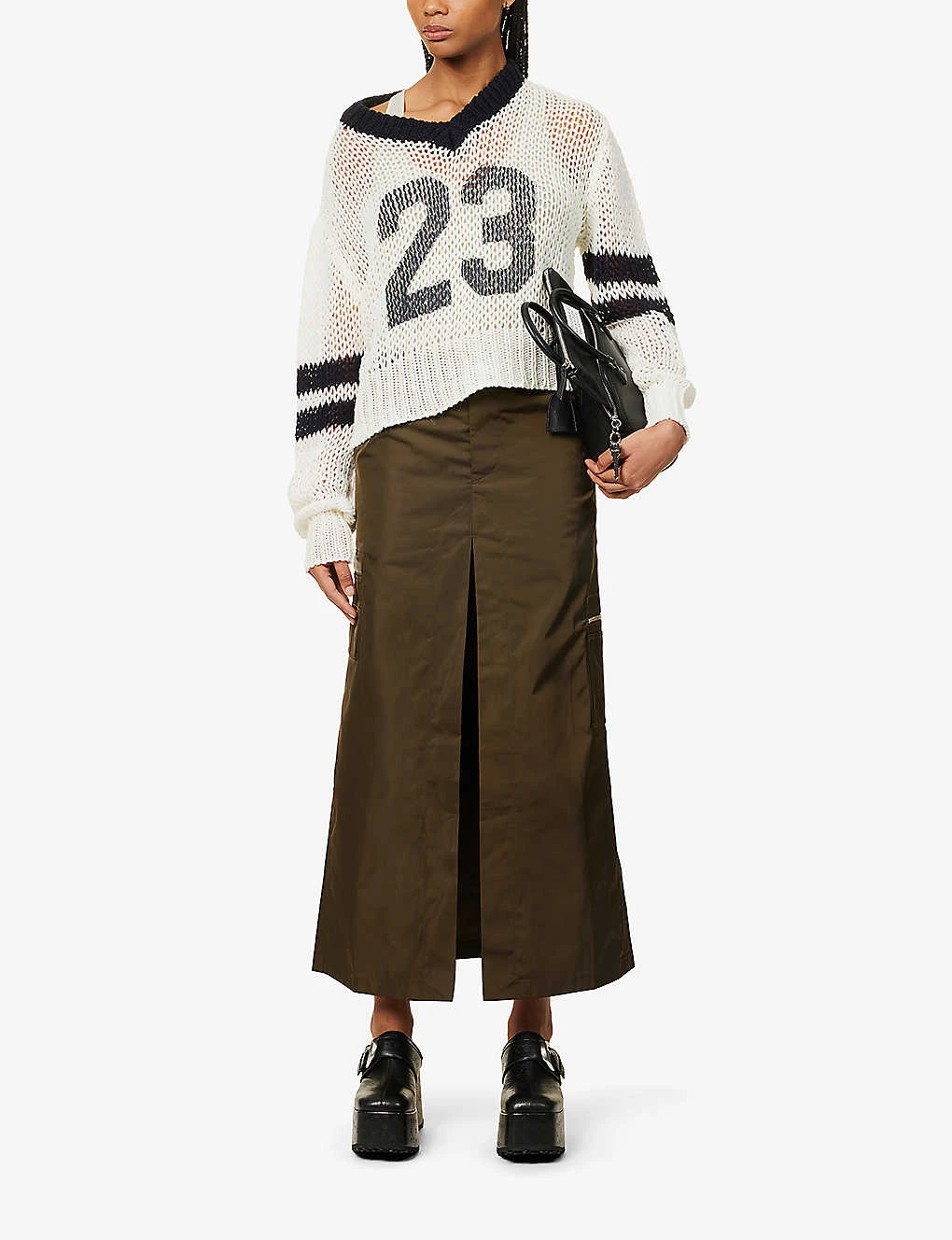 - Regular fit, V-neckline, long sleeves, numeral pattern at front, mesh knit pattern, contrast ribbed trims