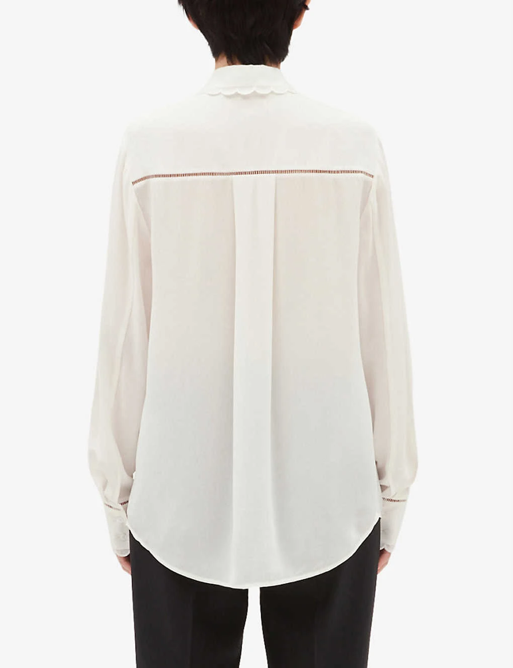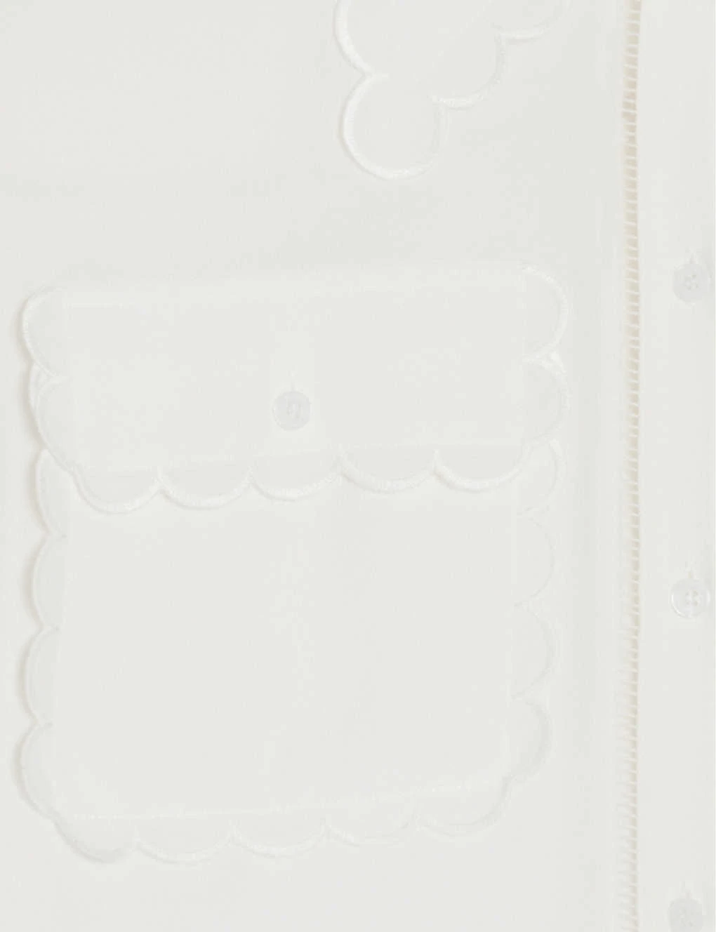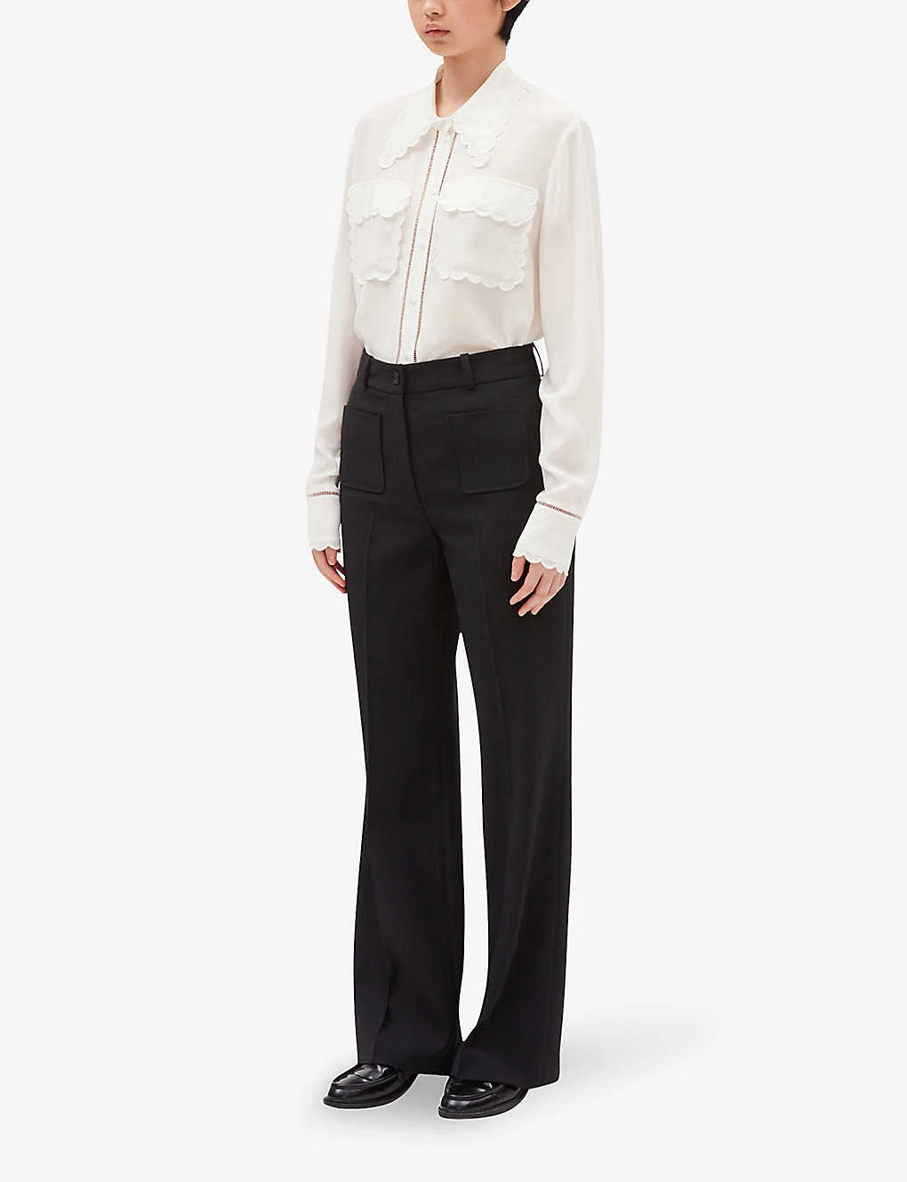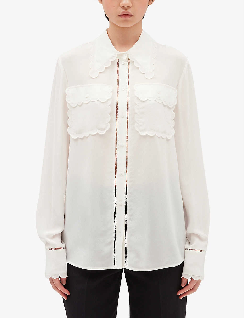 - Point collar with scalloped trim, long sleeves, scalloped cuffs, patch pockets scalloped, openwork inserts, straight fit
