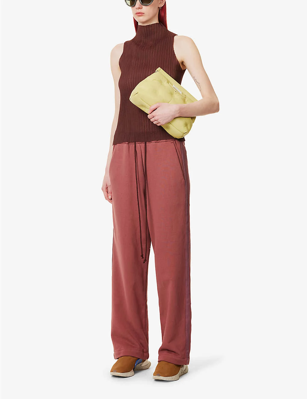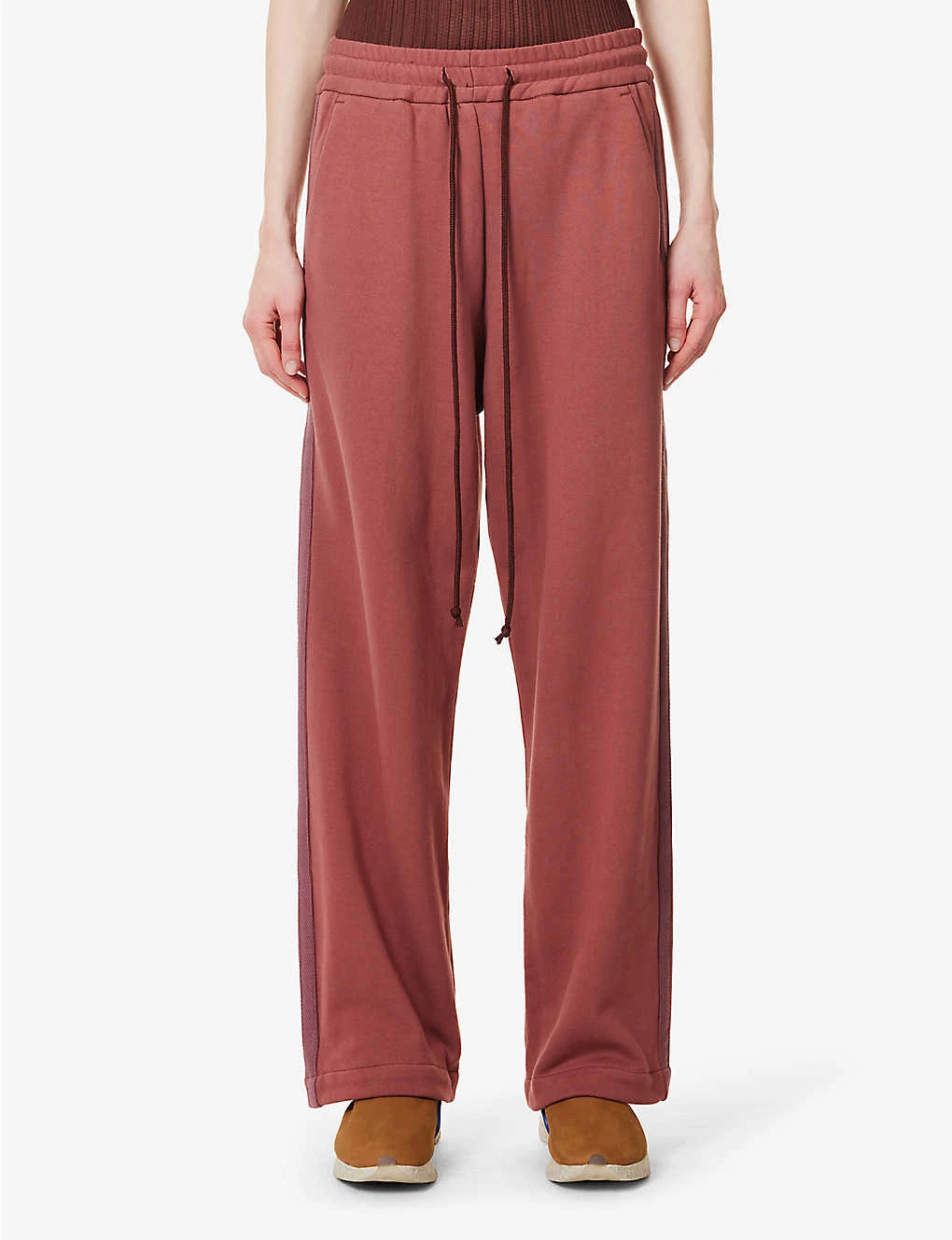 - Relaxed fit, high rise, straight leg, elasticated drawstring waistband, two slip pockets at sides, contrast taping at sides, partially lined