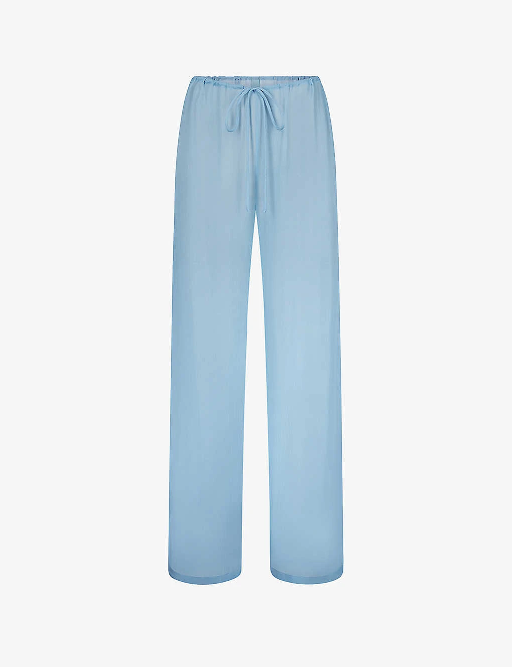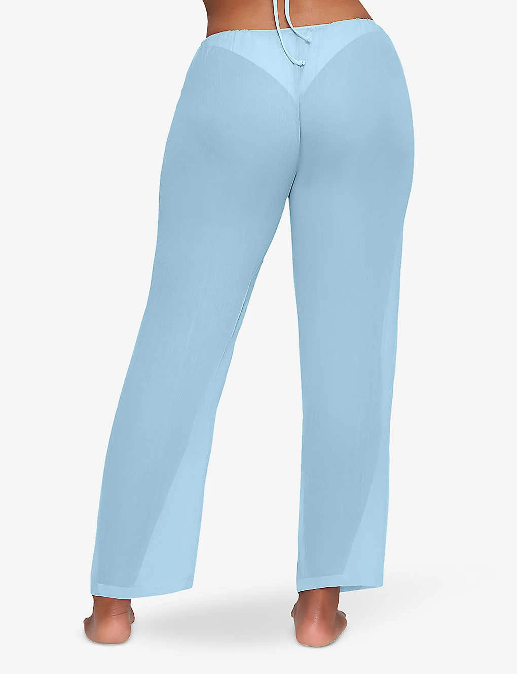 - Low rise, wide leg, adjustable drawstring waistband, sheer fabrication, unlined