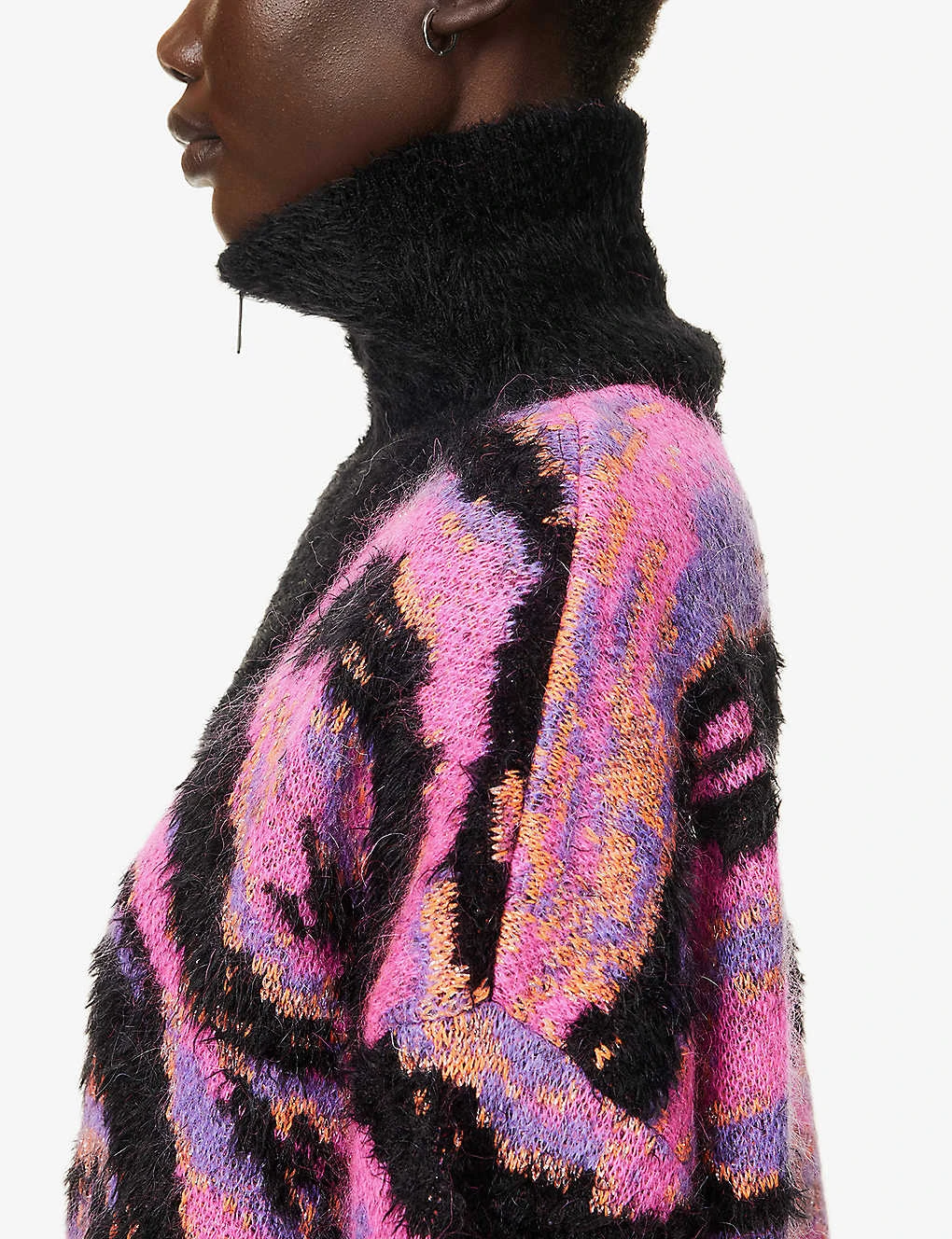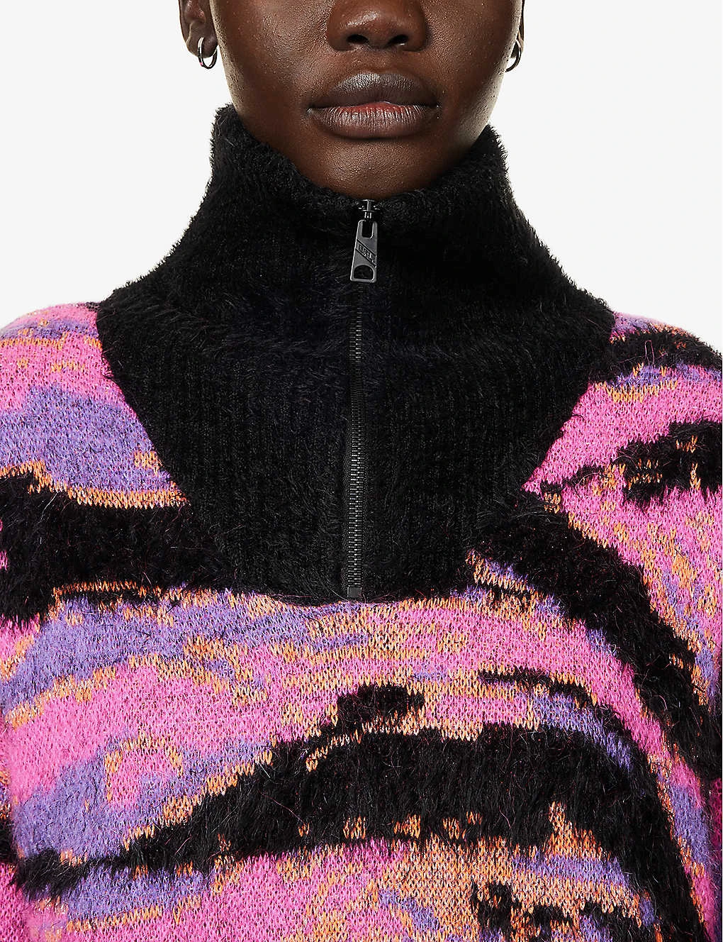 - Relaxed fit, high neck, dropped shoulders, long sleeves, all-over abstract knit pattern, metallic thread weave, brushed texture, branded hardware