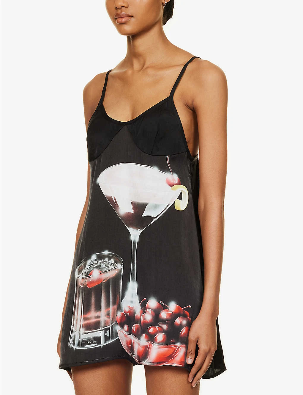 - Relaxed fit, V-neck, shoulder straps, darts at cups, graphic design at front, flared hem