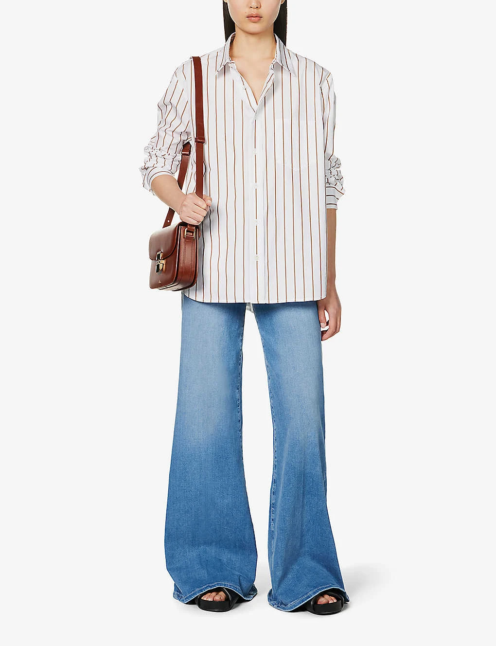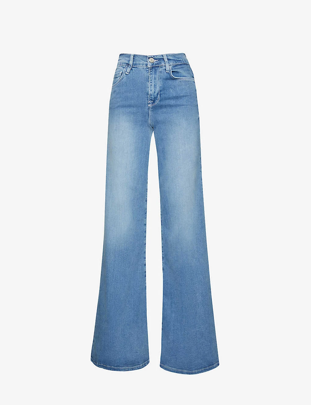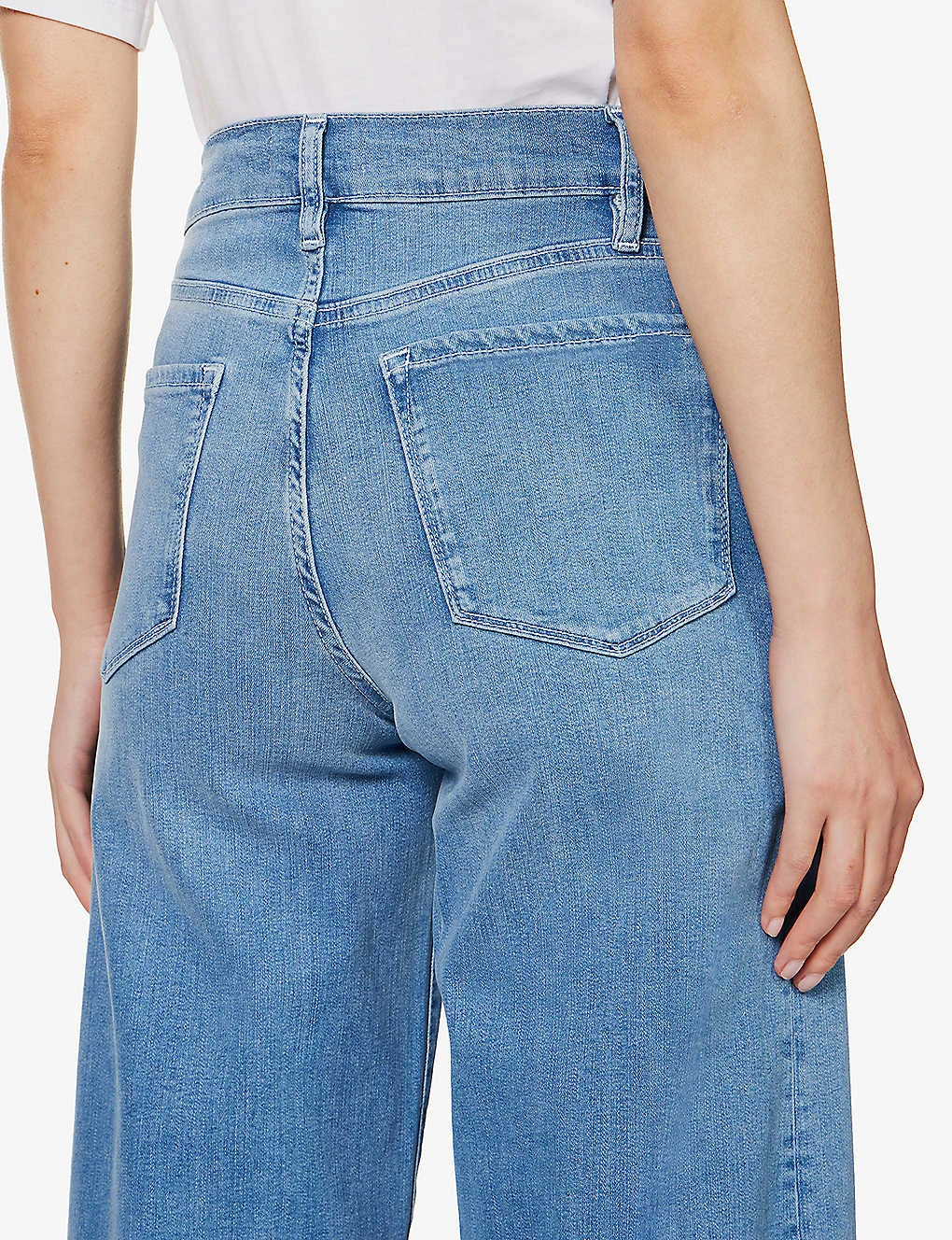 - Regular fit, high rise, wide palazzo leg, structured waistband with belt loops, five pockets, curved yoke at back, mid-wash, contrast stitching, branded silver-toned hardware