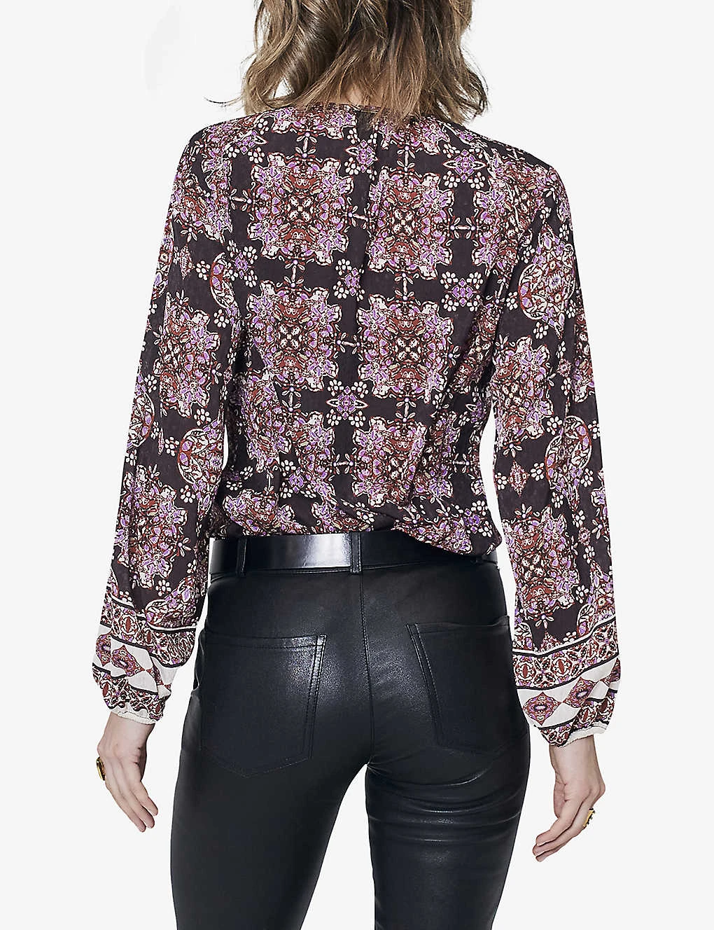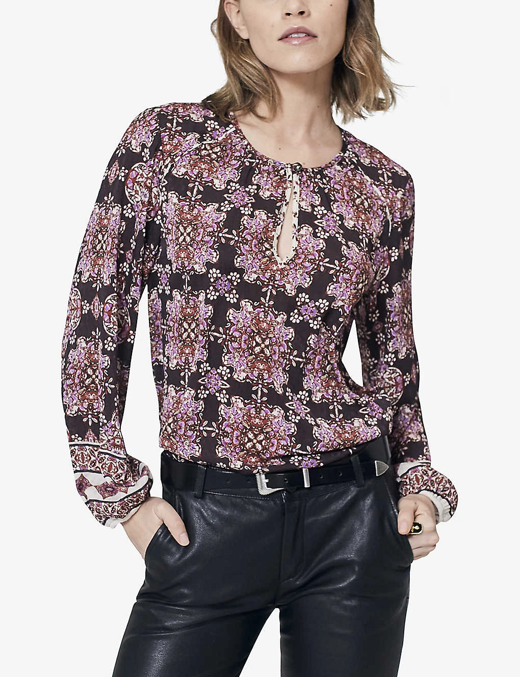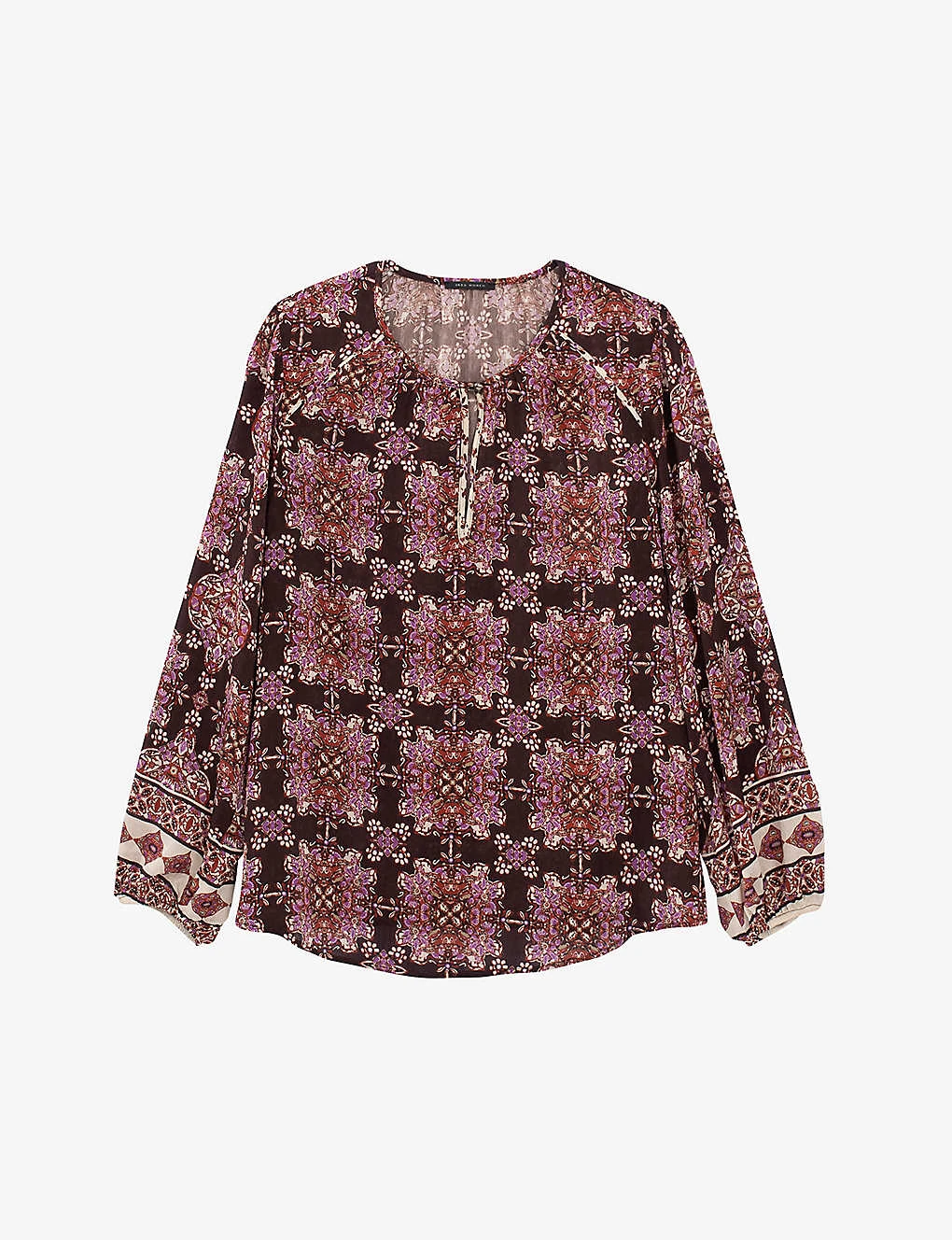 - Loose fit, round neck, single button front closure, long sleeves, all-over boho print