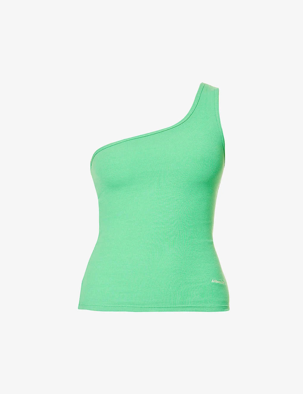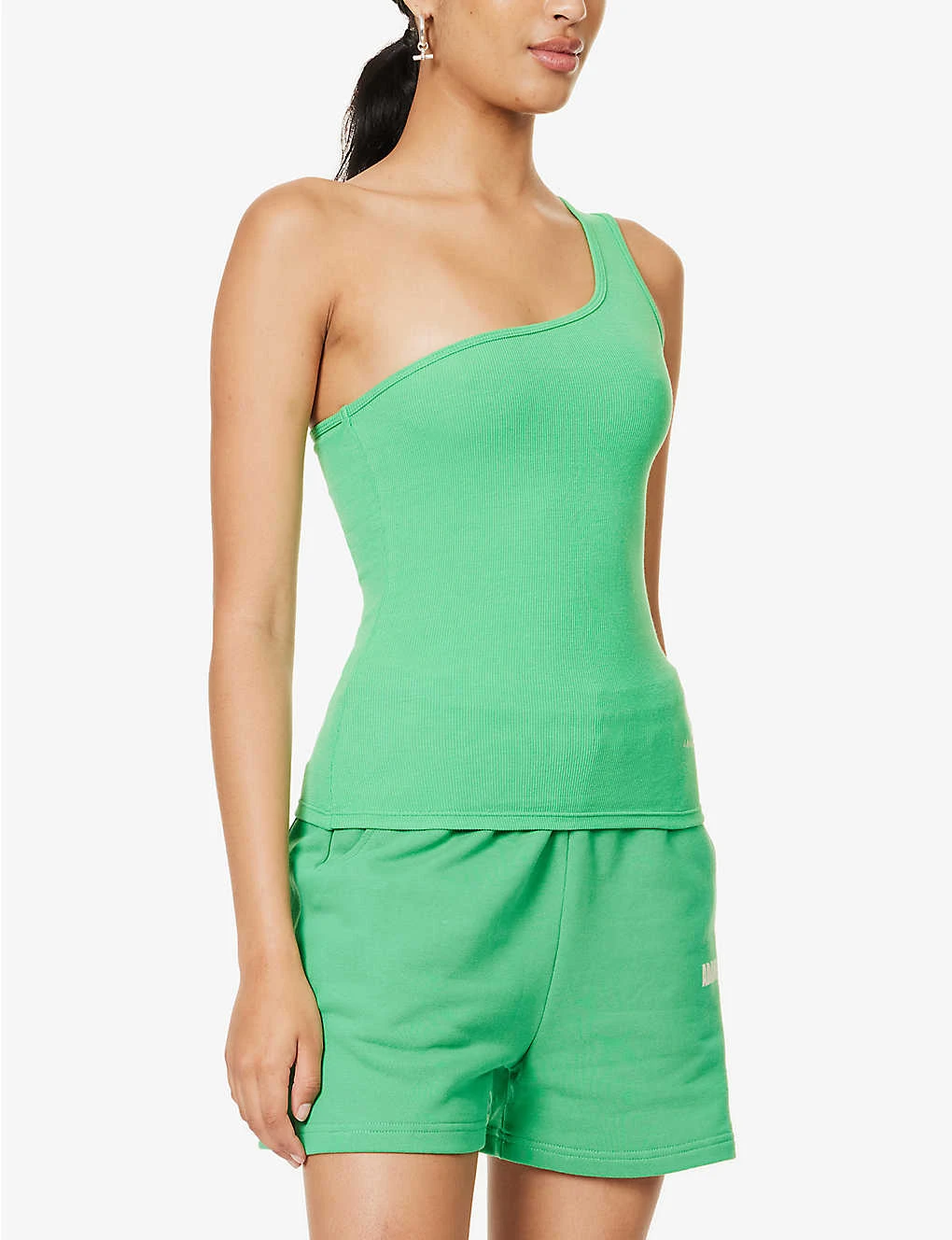 - Slim fit, asymmetric neckline, sleeveless, one shoulder, brand text embroidery at front, ribbed texture