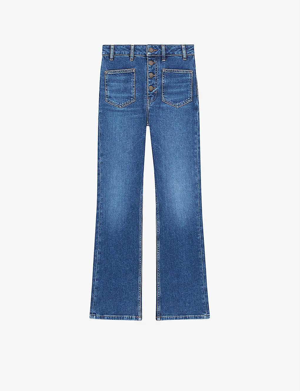 - High-rise, button-fly, faded details, front and back patch pockets, slightly flared leg
