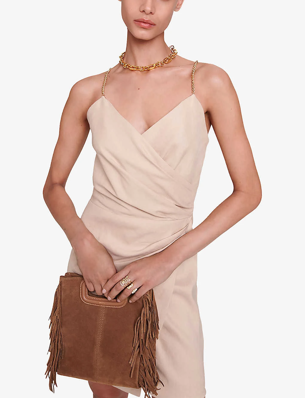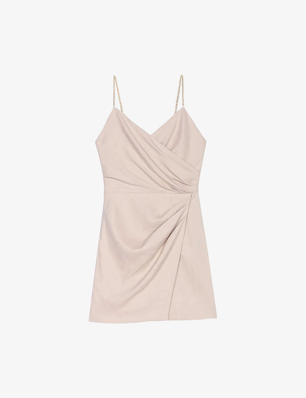 - Slim fit, V neck, sleeveless, mini length, wrap effect, draped design, pleated front, gold-tone adjustable and detachable chain straps, asymmetric design