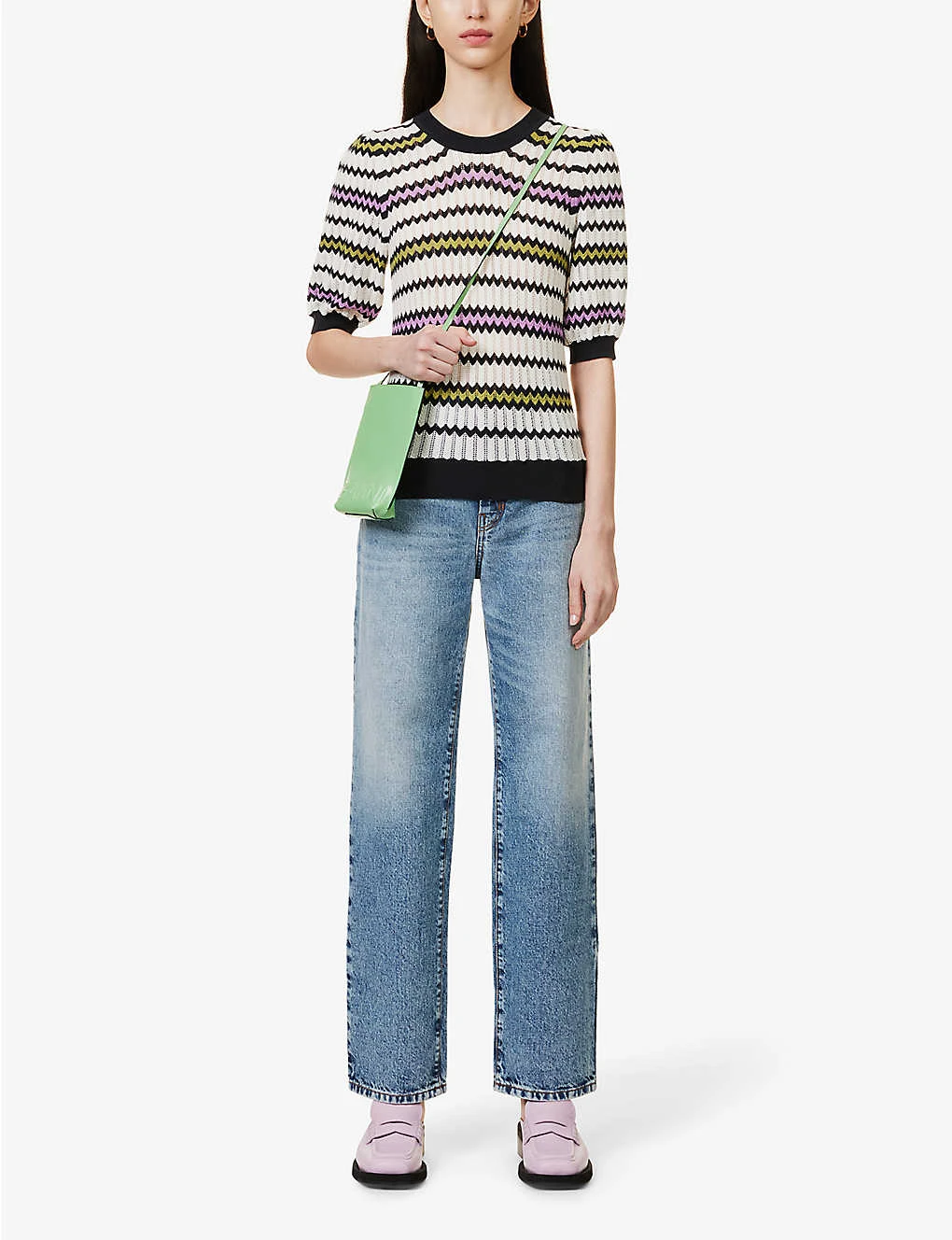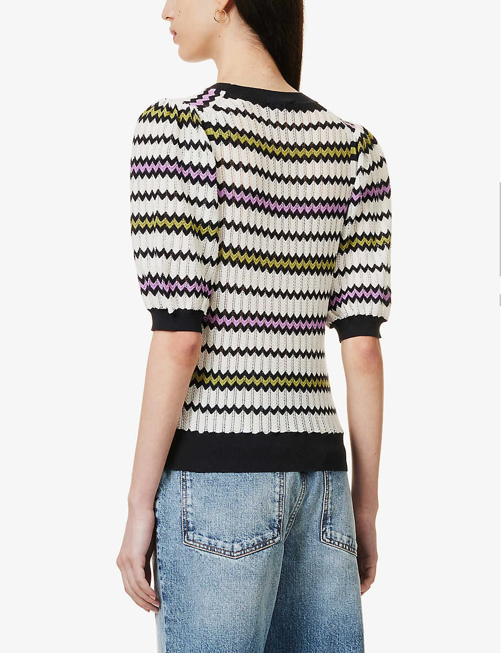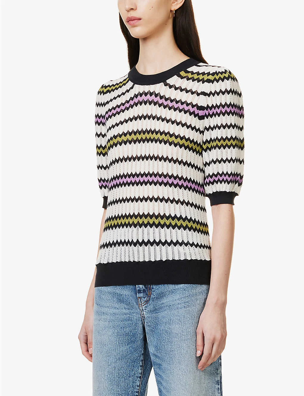 - Regular-fit, scoop neck, short puffed sleeves, fine open knit, all-over zig-zag pattern, contrasting ribbed trims