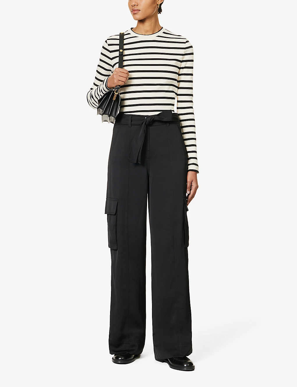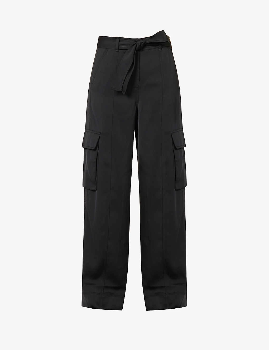 - Relaxed fit, high rise, wide leg, belt loops, detachable self-tie belt at waist, two slip pockets at front, two flap pockets at sides, two flap pockets at back, partially lined