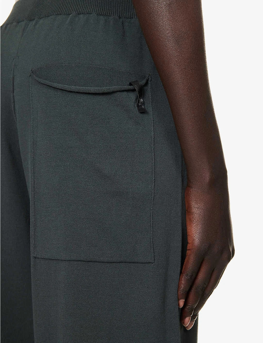 - Regular fit, mid-rise, tapered leg, patch pocket at back, fine knit texture, ribbed hems