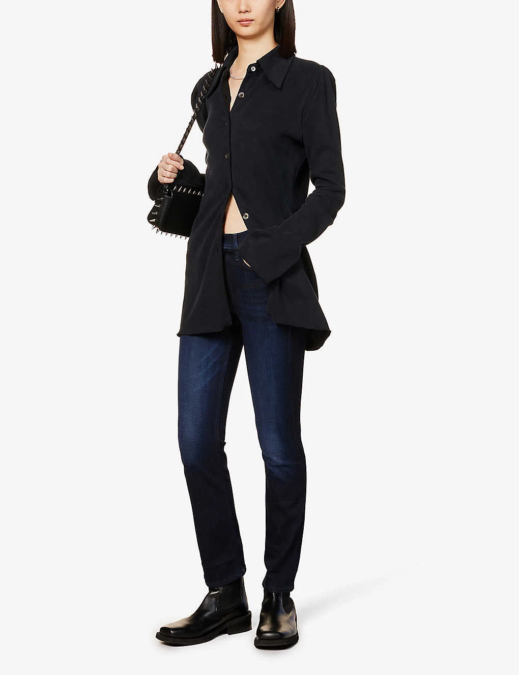 - Exposed button and concealed zip-fly fastening at front