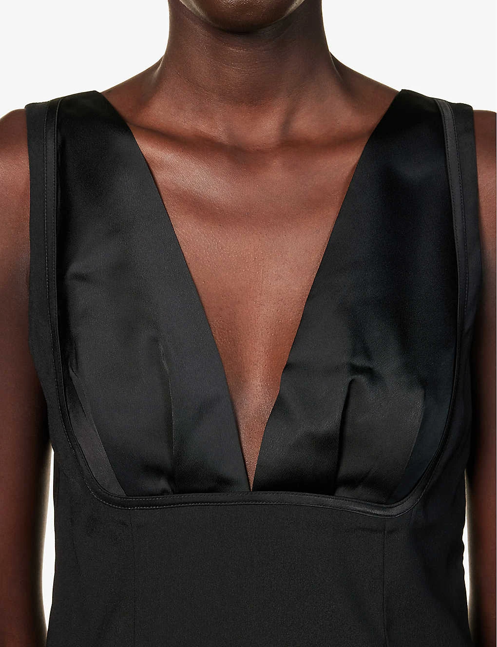 - Slim fit, plunge V-neckline, sleeveless, soft pleated cups, low scoop back, panelled pattern, soft crepe texture, lined