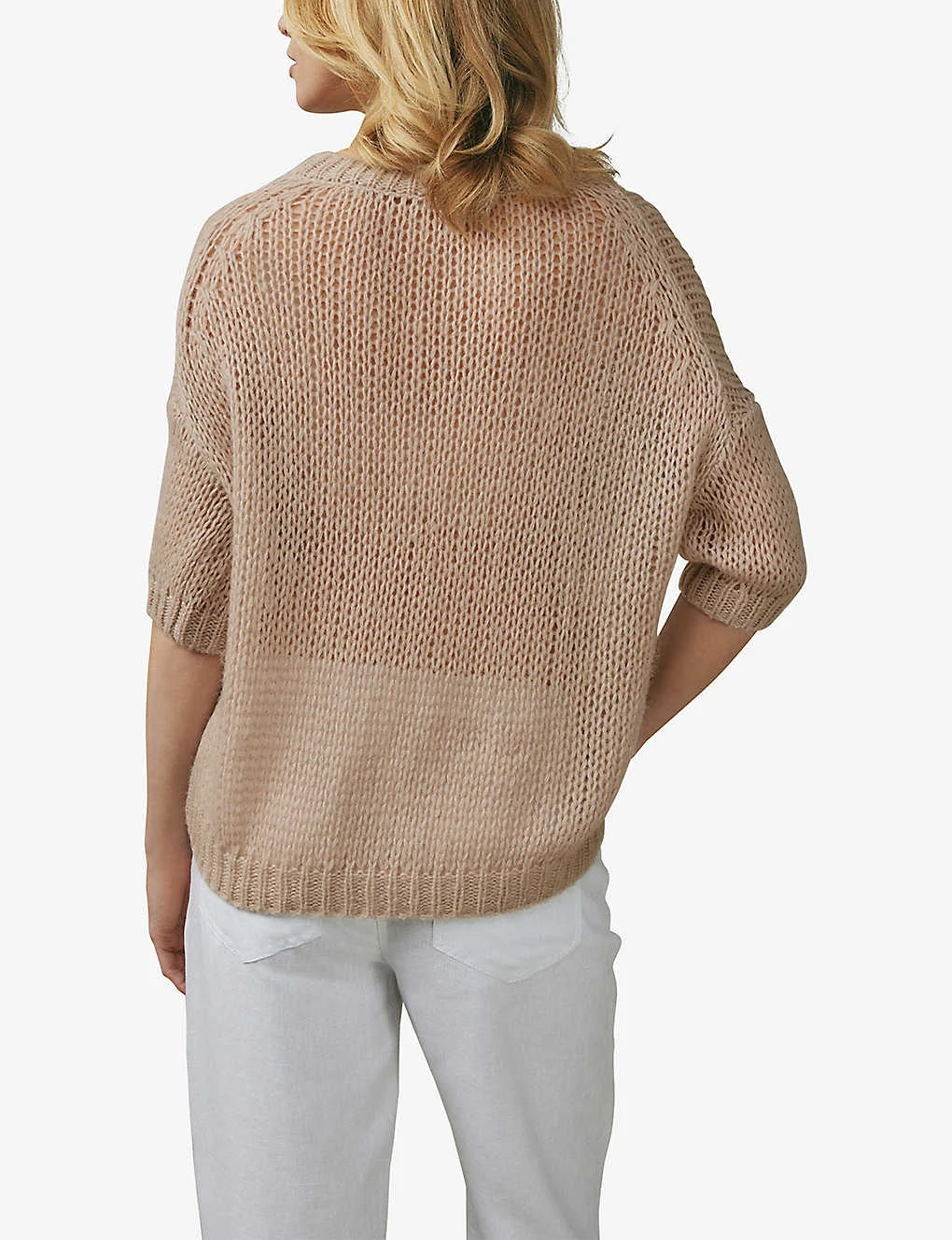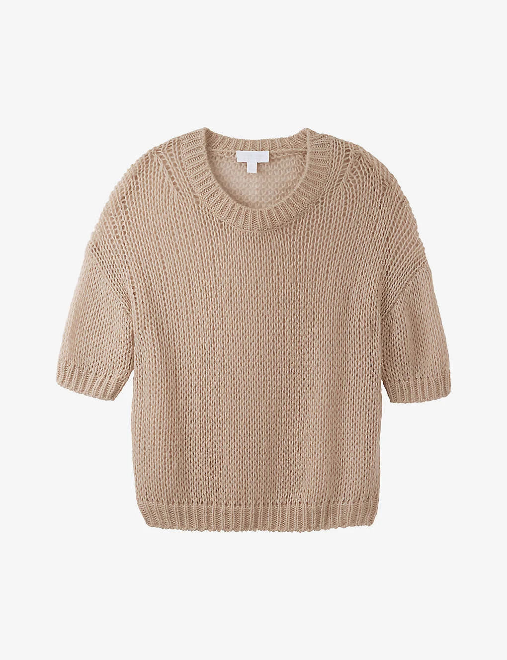 - Round neck, dropped shoulders, short sleeves, oversized, open knit, ribbed trims