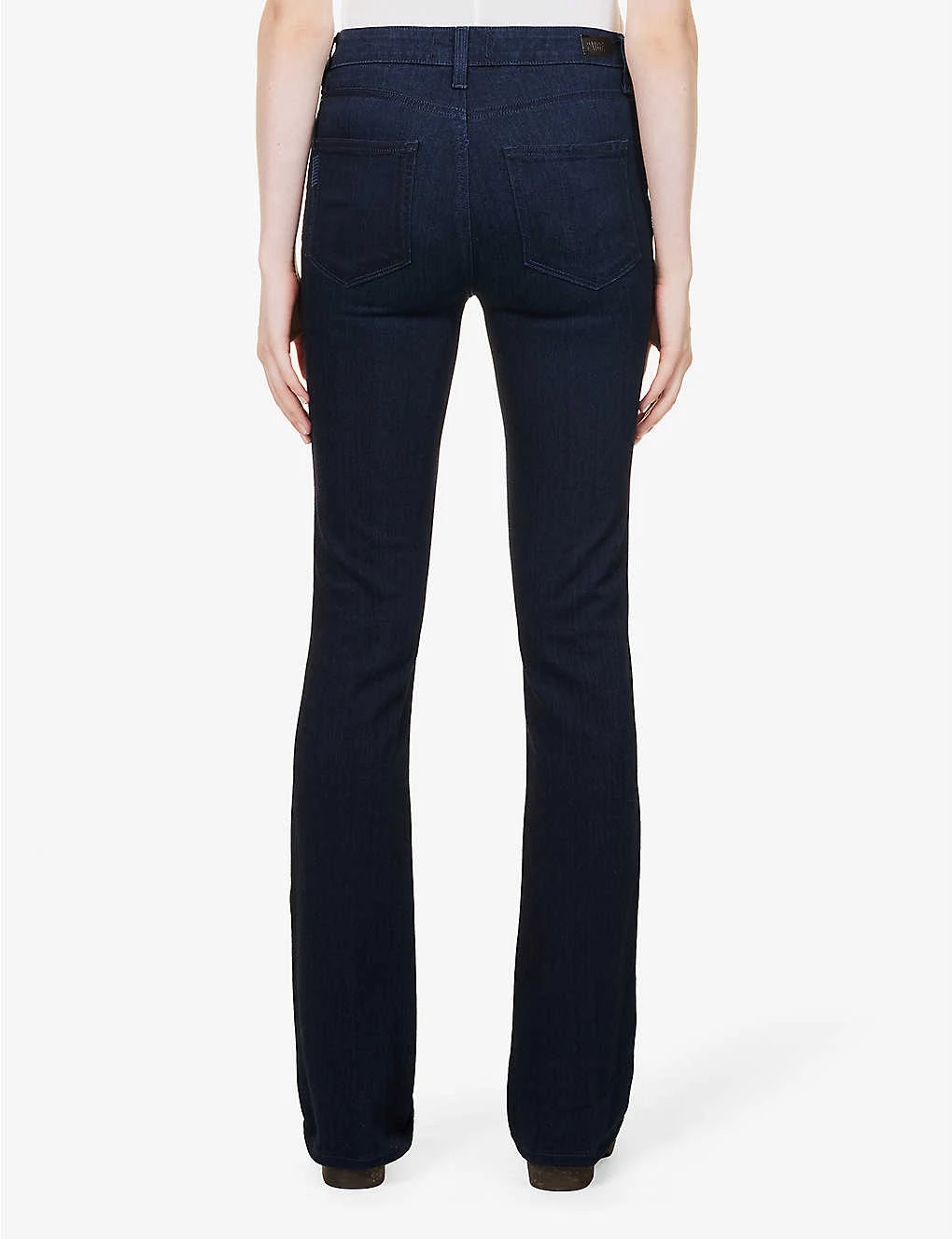 - Slim fit, high rise, bootcut leg, structured waistband, belt loops, five pockets, curved yoke at back, patent brand patch at back, contrast stitching, mid-wash, branded silver-toned hardware
