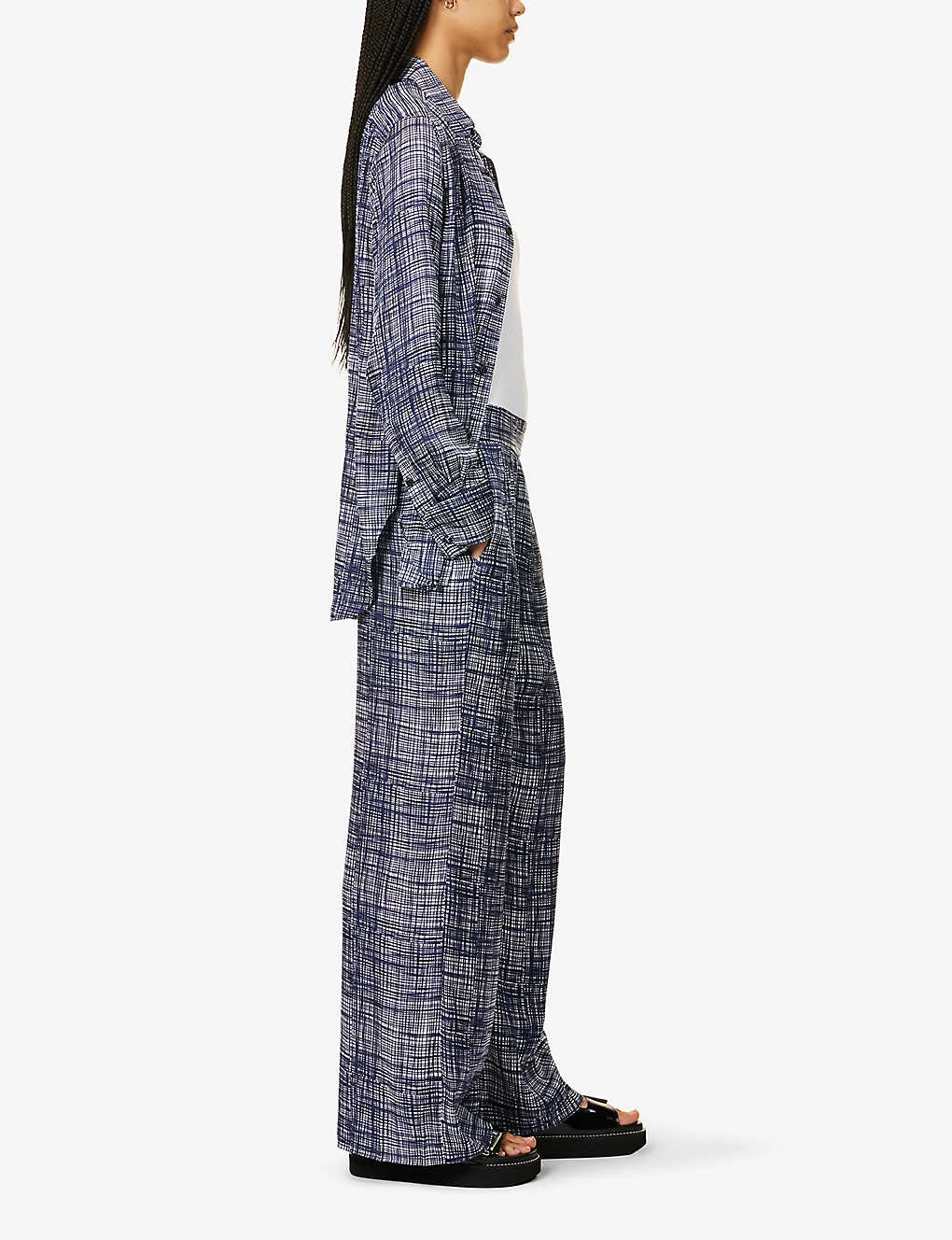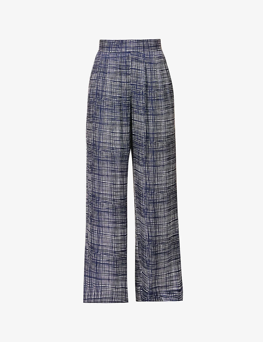 - Relaxed fit, mid-rise, wide leg, partially elasticated waistband, two slip pockets at front, all-over print