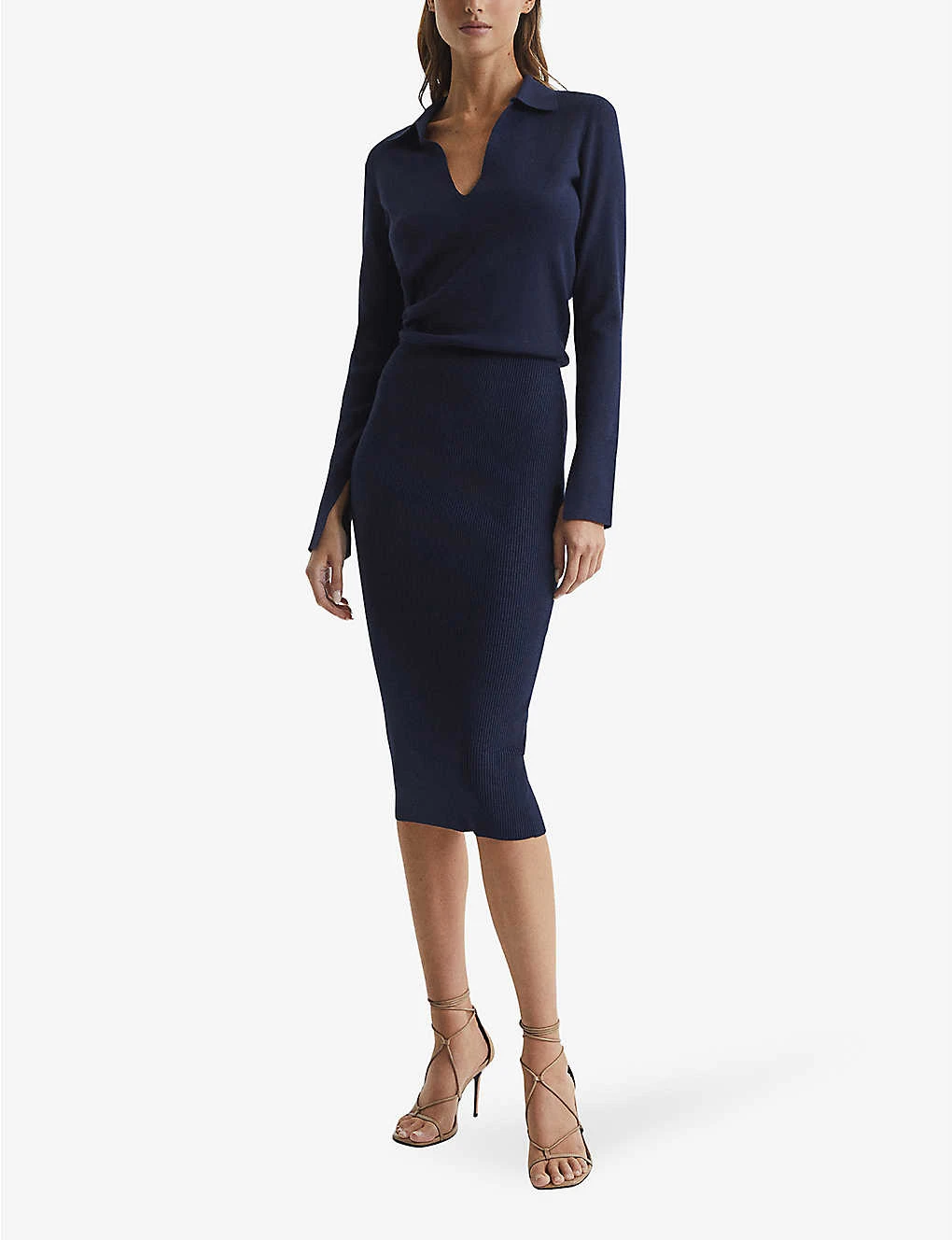 - Collar, v-neck, long sleeves, slit at the cuffs, contrast ribbed texture at the skirt, midi length, pencil silhouette
