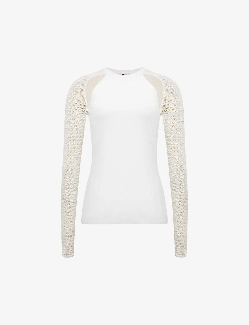 - Slim fit, round neck, cut out at shoulders, long sleeves, sheer-knit sleeves, straight hem