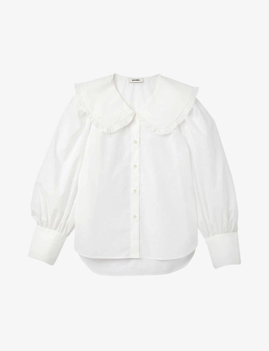 - Peter Pan collar with ruffled trims, long full sleeves, buttoned cuffs, stepped hem
