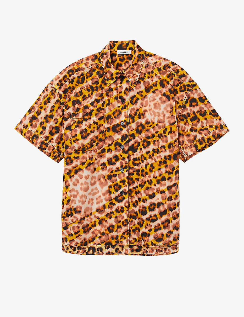 - Oversized fit, shirt collar, shorts sleeves, one patch pocket at chest, all-over leopard print