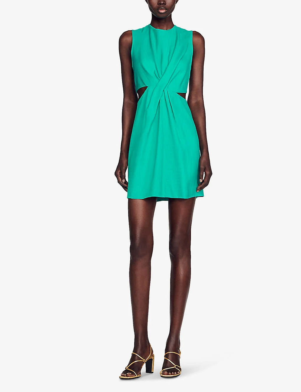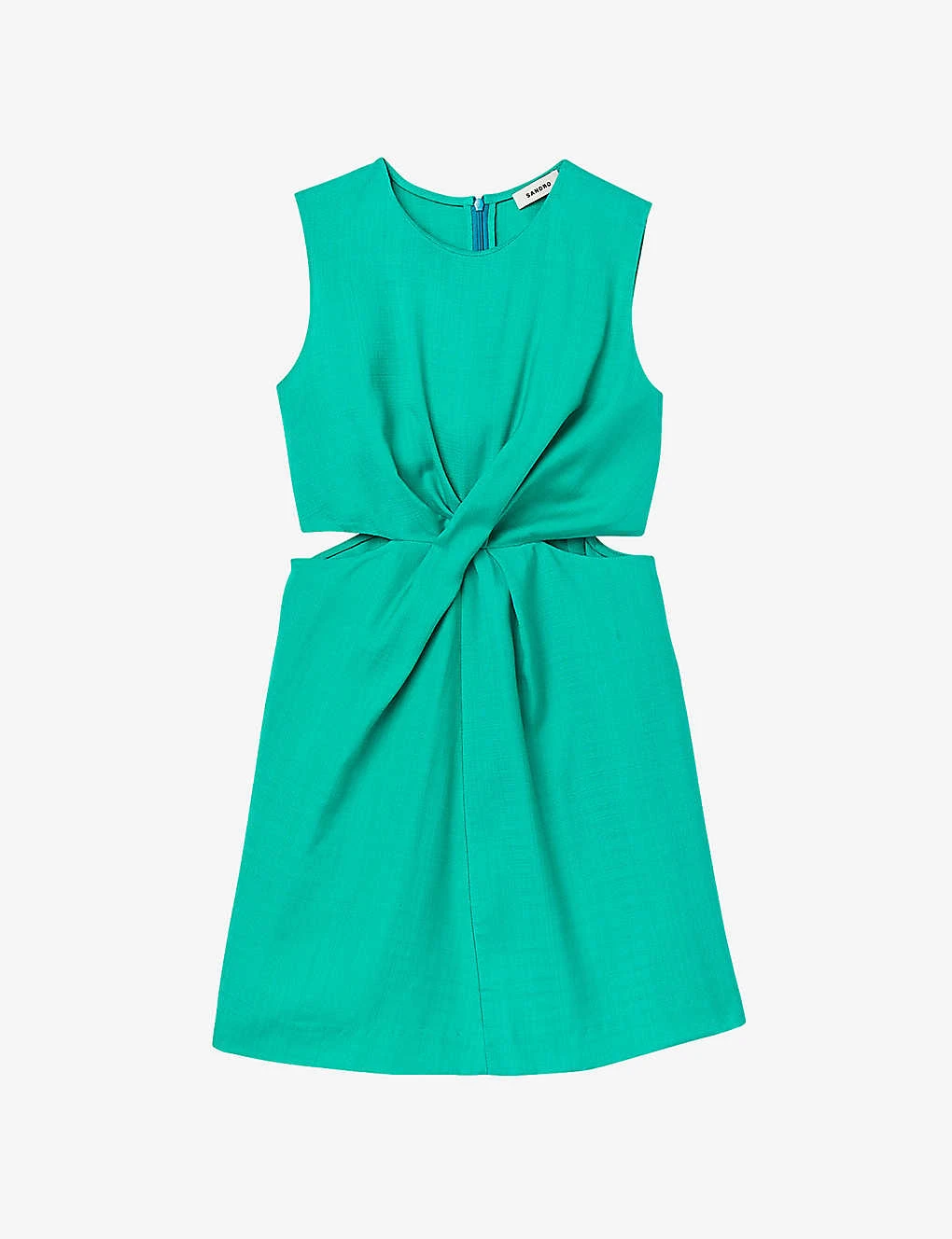 - Round neck, sleeveless, gathered detail to the front, cut-outs at the waist, straight fit