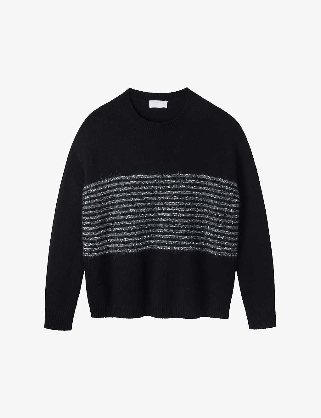 - Relaxed fit, long sleeves, round neck, knitted construction, striped panel at front, sequin embellishment at front, ribbed trims, dropped shoulders, straight hem