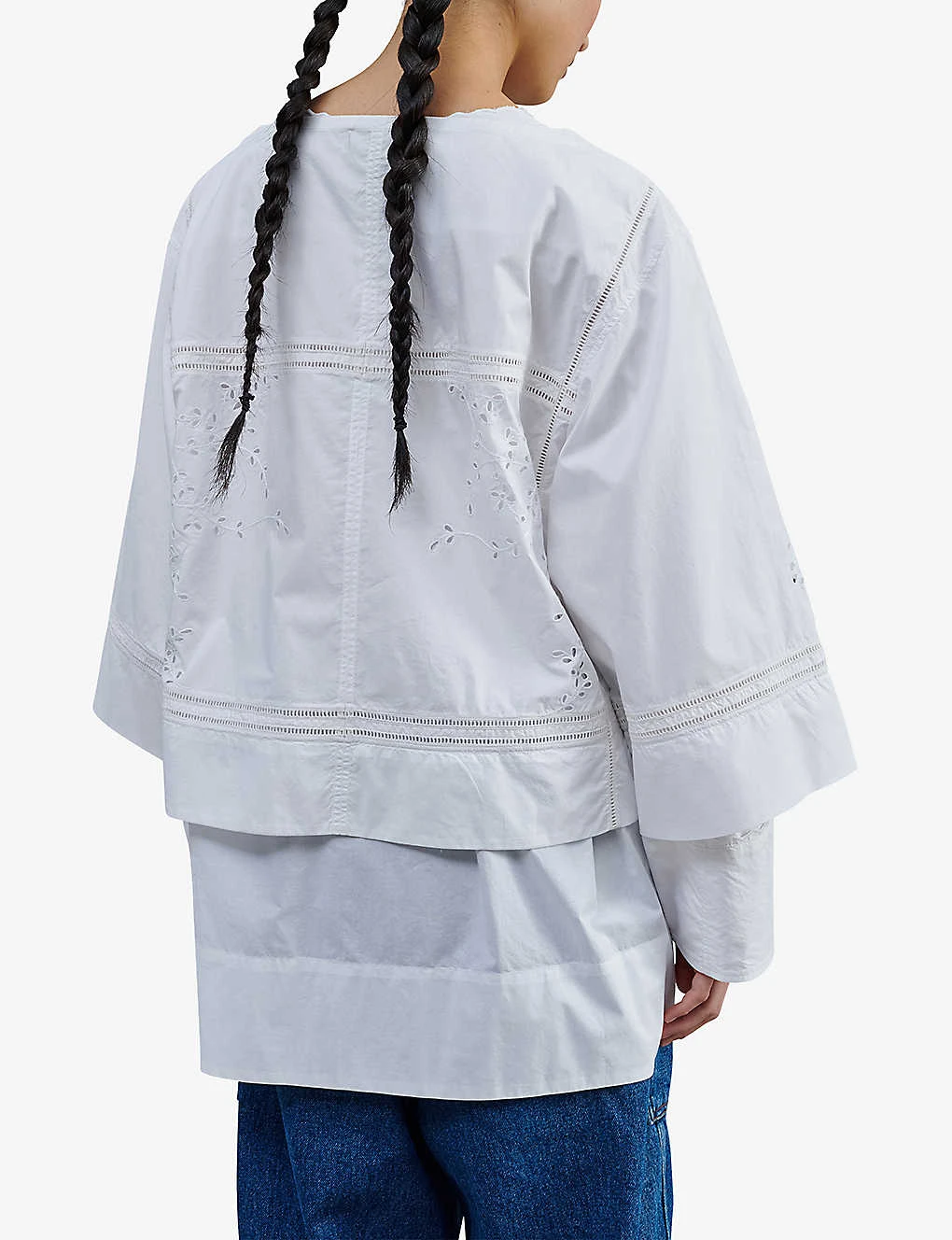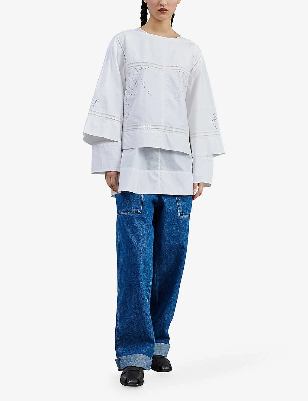 - Oversized fit, boat neck, frill trim at neck, broderie anglaise-embroidery, long flared sleeves, double cuffs, tiered hem