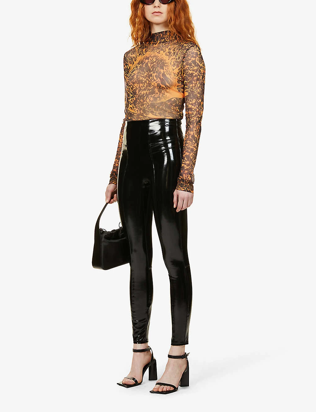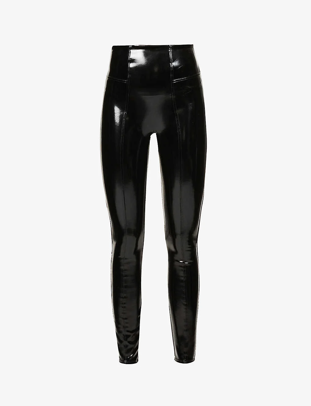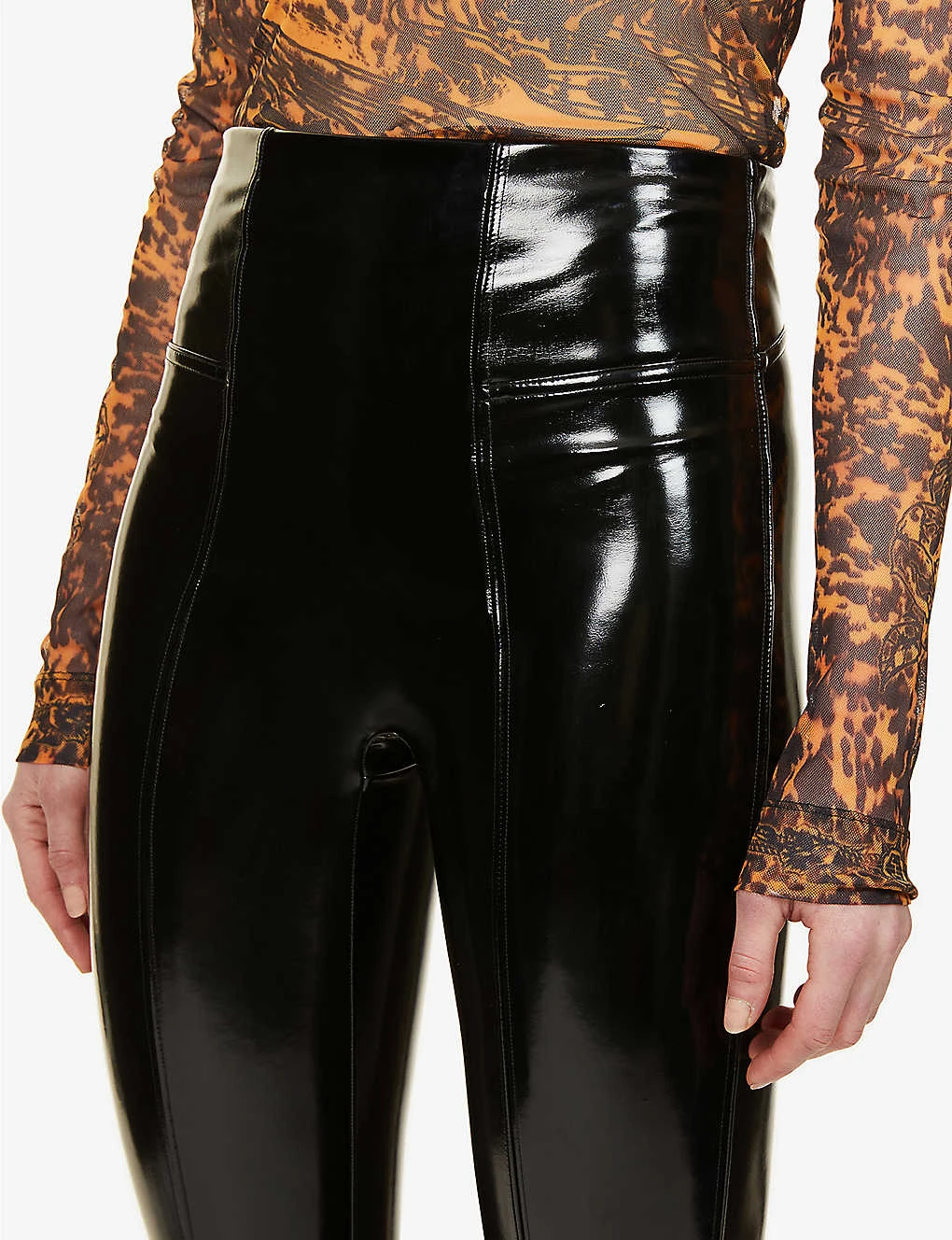 - High-rise, slim-fit, all-over patent texture, arched yoke at back, straight hems