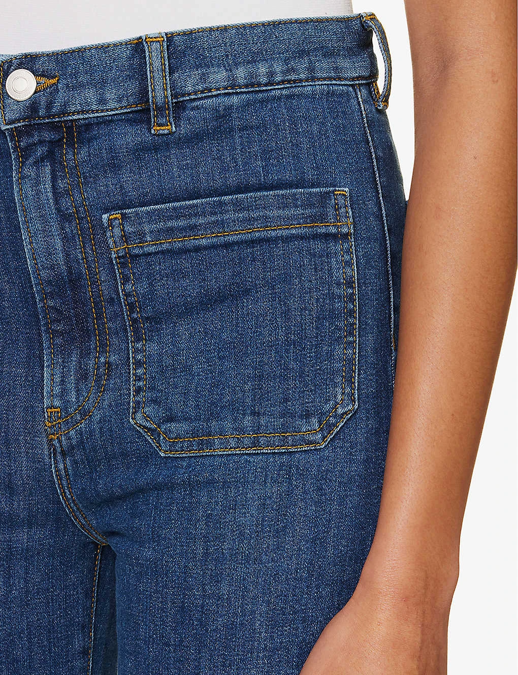 - Regular fit, high rise, flared leg, belt loops, contrast stitching, two patch pockets at front, darts at back, two patch pockets at back, brand patch at back