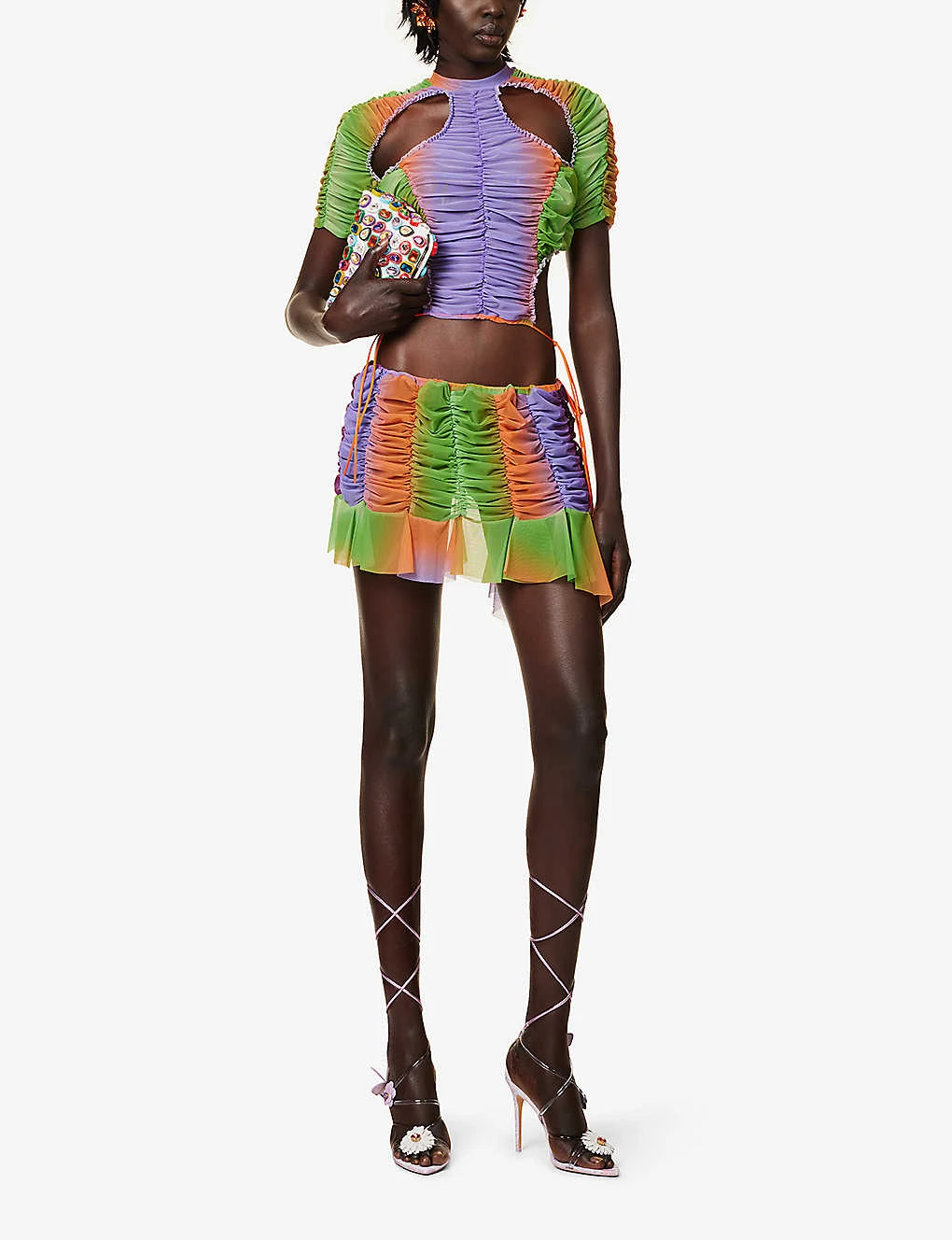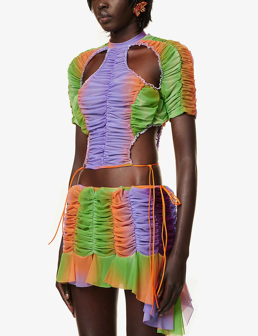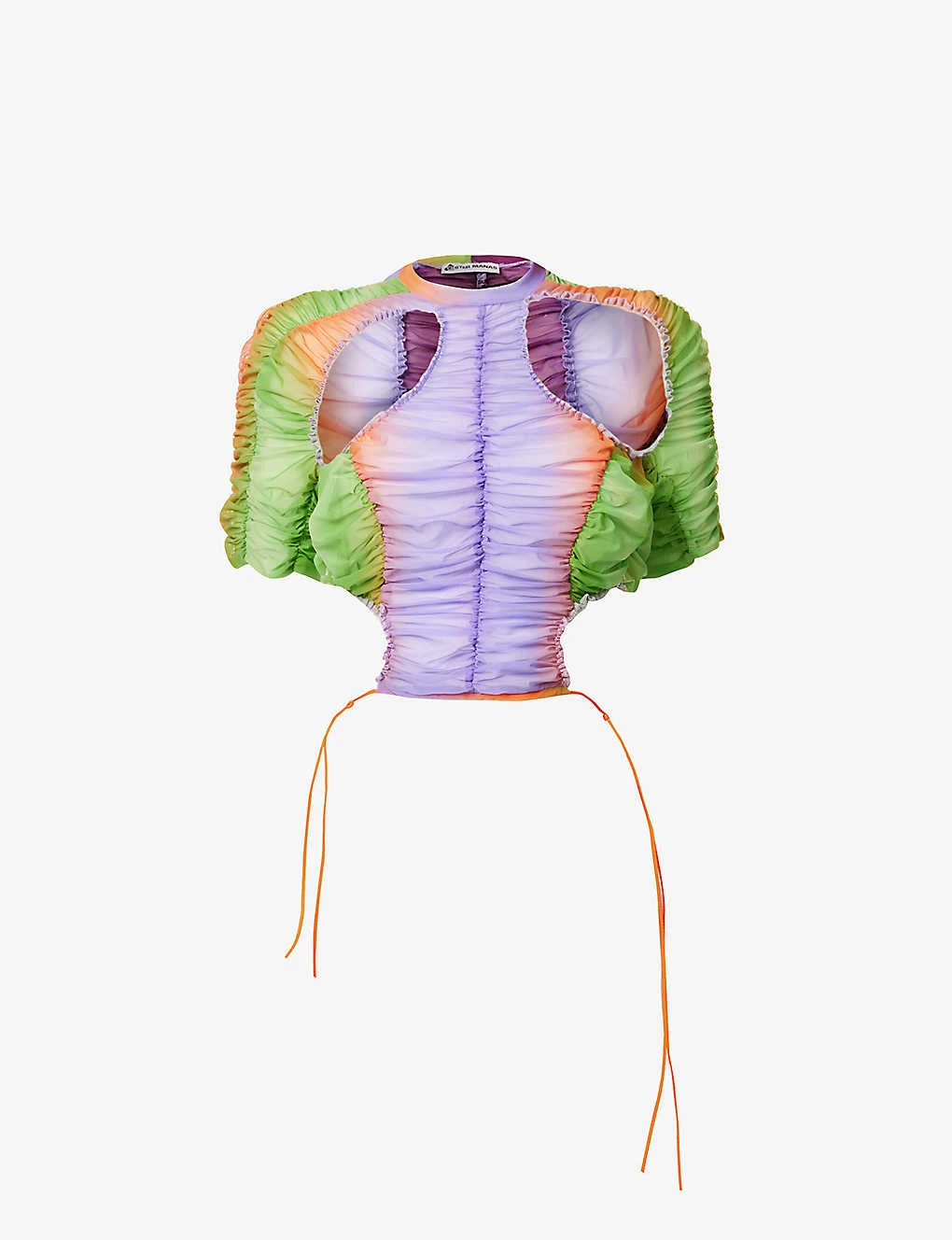 - Slim fit, round neck, three quarter sleeves, cut-out panels at front, split at sides, ruched pattern, sheer, drawstring hem
