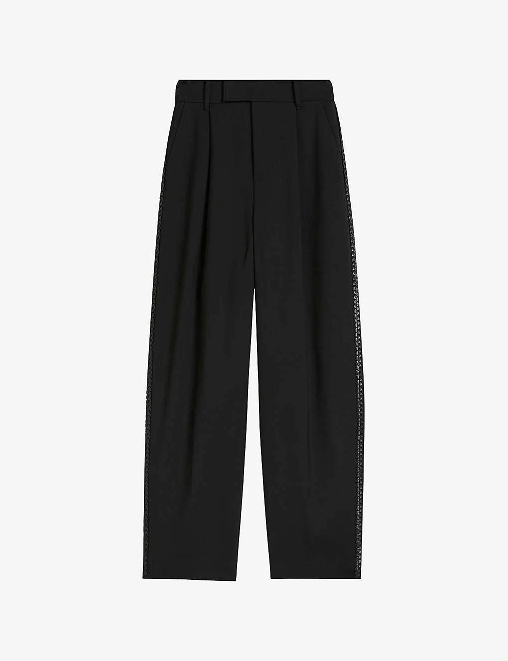 - Regular fit, high rise, wide leg, belt loops, two slip pockets at sides, two knife pleats at waist, pressed centre pleats at front, braided panels at sides, partially lined