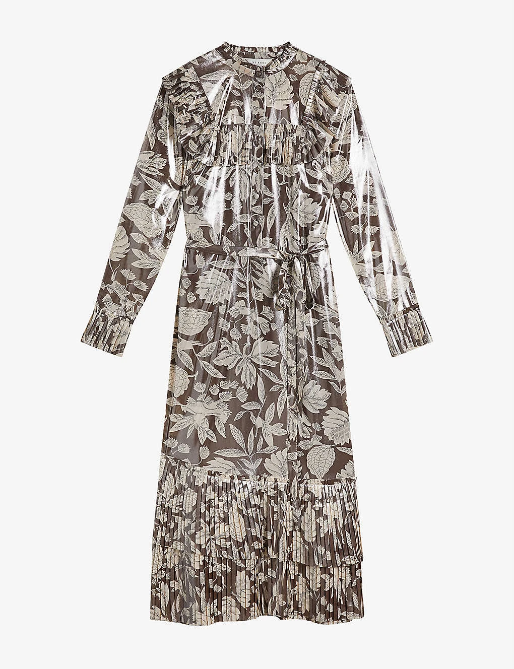 - Pleated-trim collar, pleated-trim placket, long sleeves, pleated-trim collar, self-tie detail at the waist, tiered pleated hem, all-over foliage print