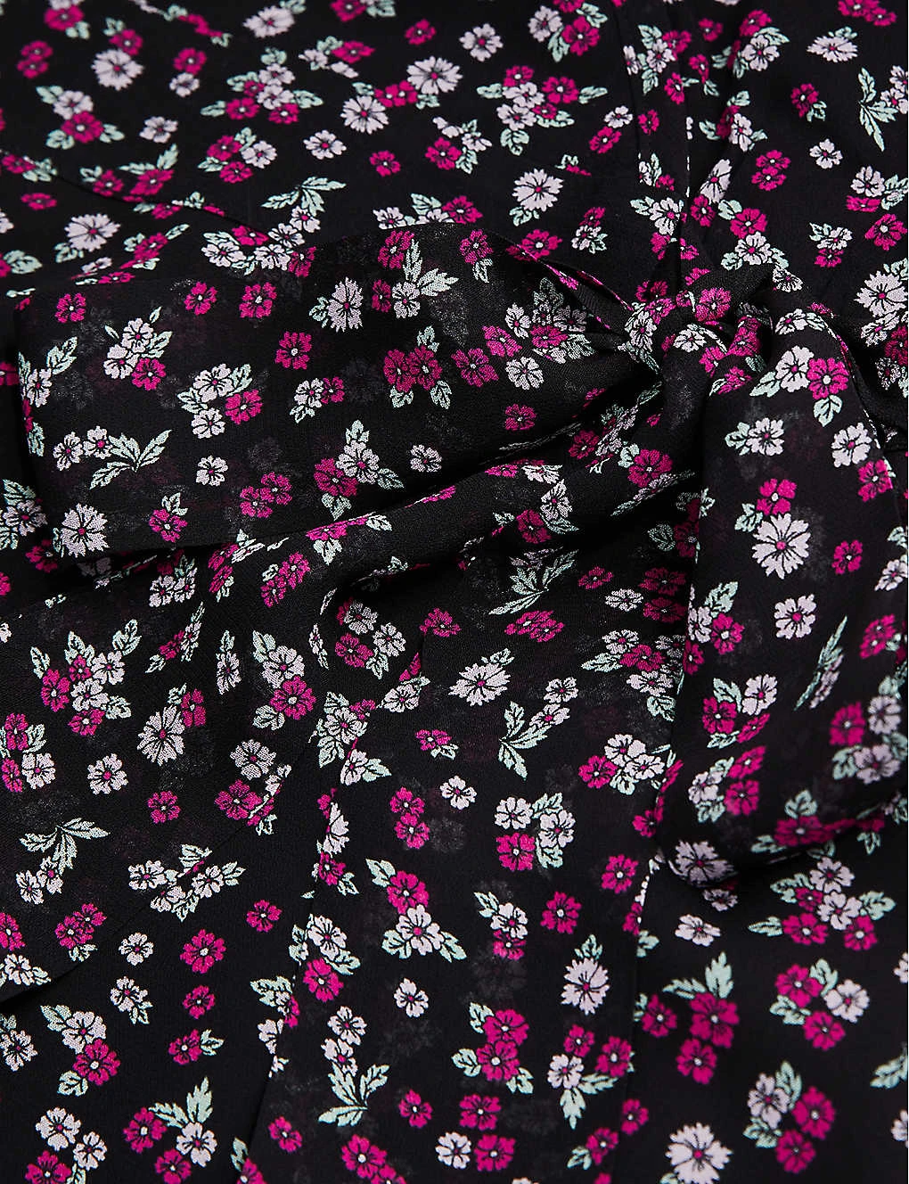 - V-neck, short sleeves, all-over floral print, wrap silhouette, self-tie fastening at waist, midi length