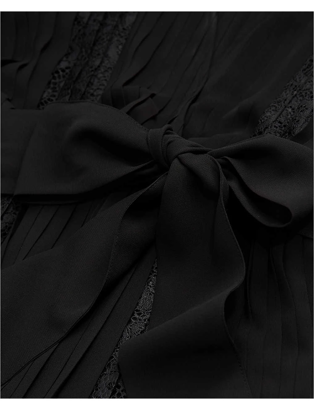 - V-neck, long sleeves, adjustable belt tie at waist, all-over lace trim, pleated design