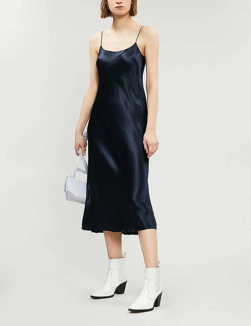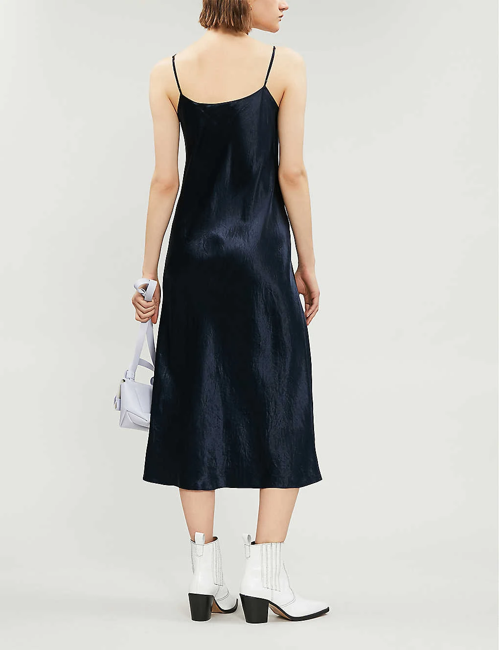 Vince satin dress Slips on Scoop neck, thin adjustable shoulder straps, sleeveless, crushed texture, flared hem 100% acetate Hand wash cold True to size Size small: Length 46″” Model is 5ft 10″” and wears a size small