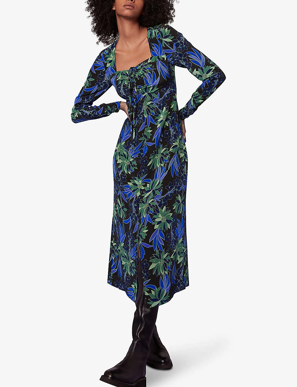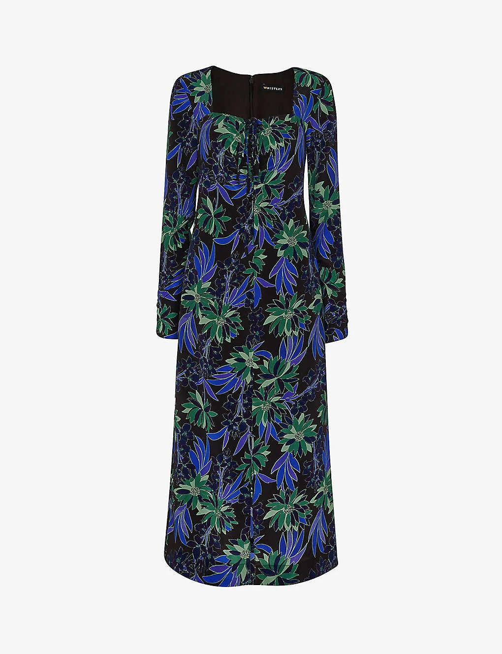 - Square neck, halterneck tie detail, long sleeves, all-over floral pattern, A-line skirt, midi length, all-over floral pattern
