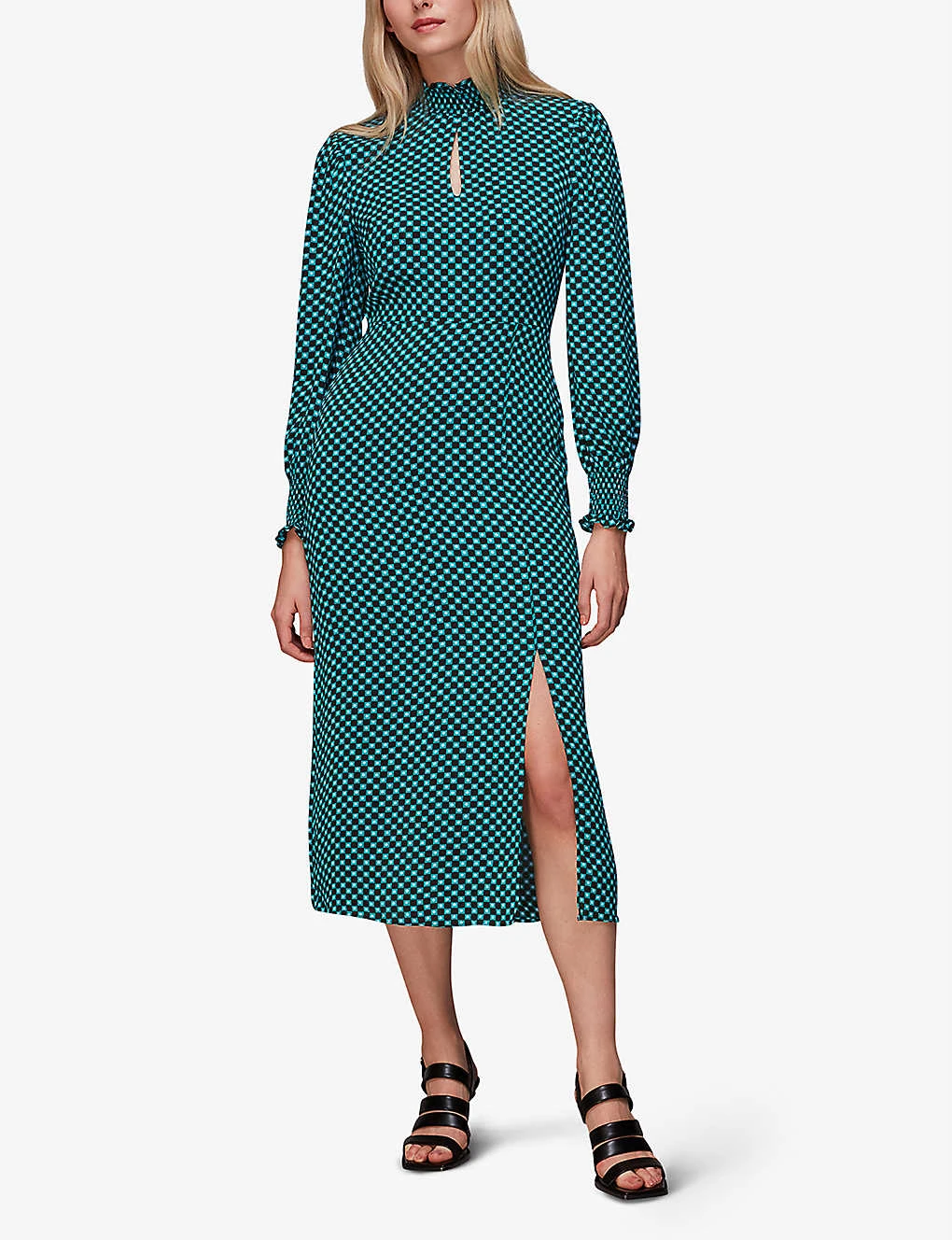 - High neck, long sleeves, shirred neck and cuffs, keyhole opening at neckline, fitted bodice, midi-length skirt, split at front hem, lined bodice